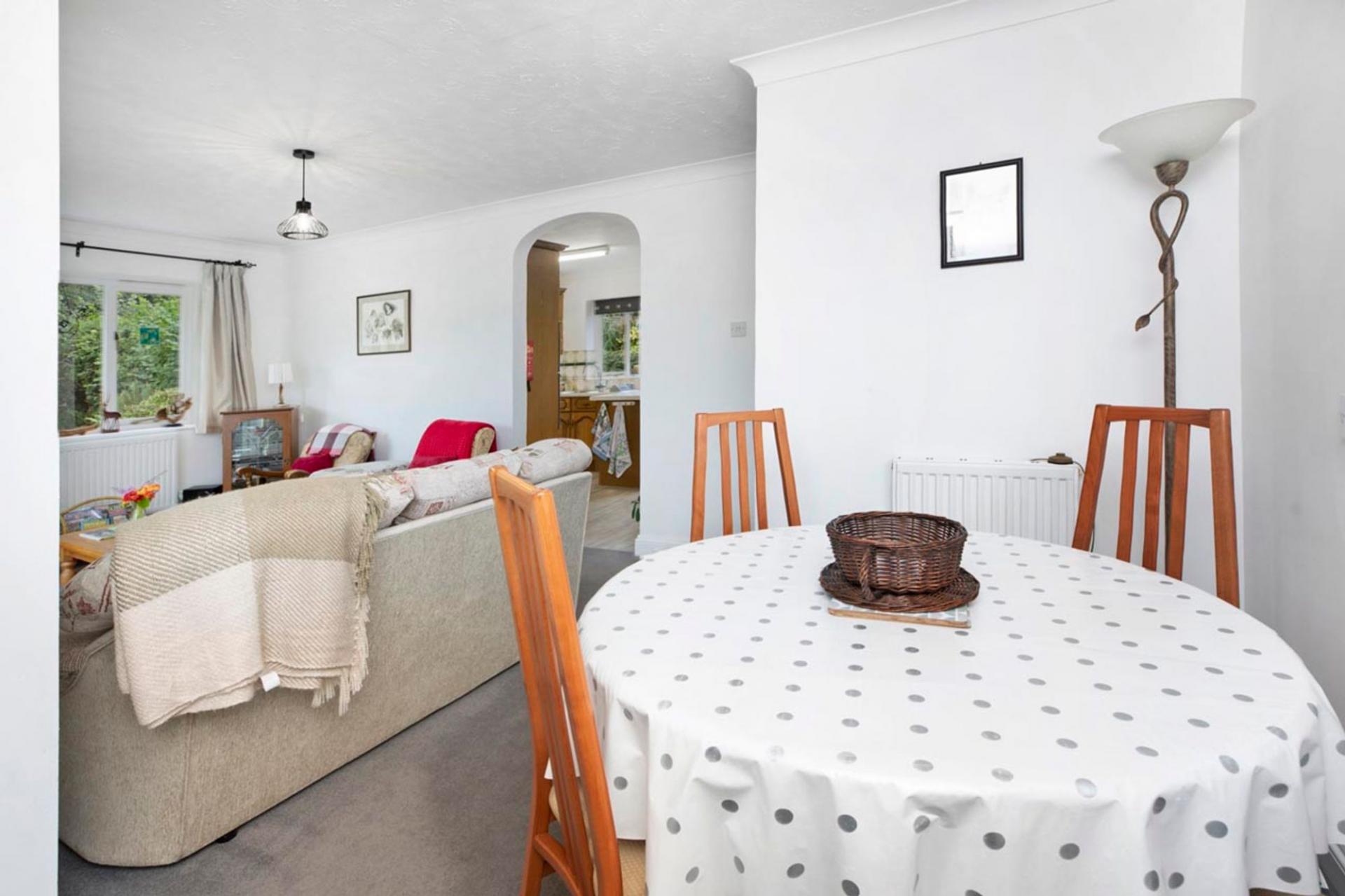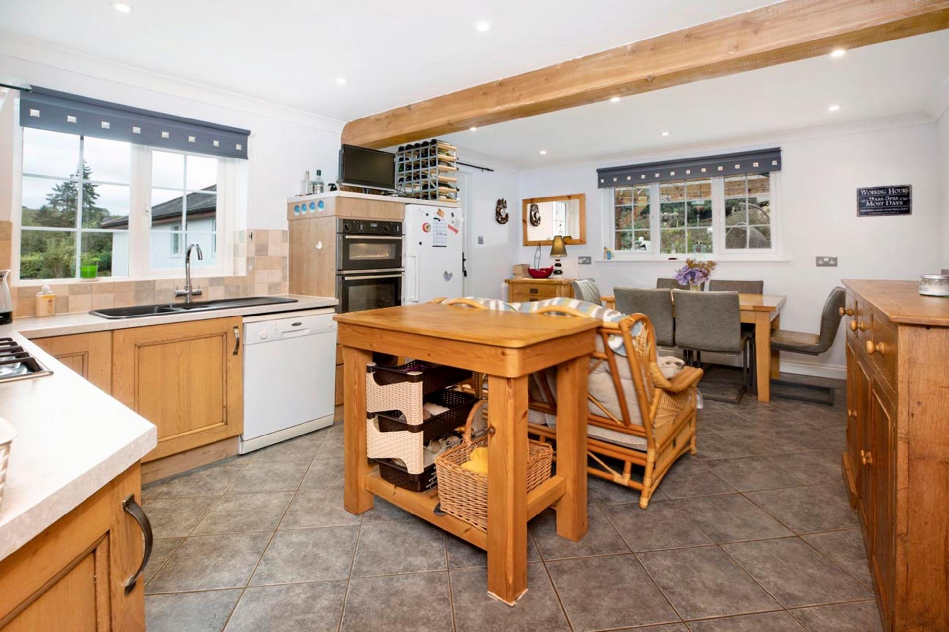 1 Knowle Cottages is a charming, semi-detached Grade II listed home that has been sympathetically extended by the current owners to create a warm and inviting home which they have lovingly lived in for some 40 years. As you enter, you are welcomed by a convenient cloakroom/WC and a versatile study with dual aspect windows, allowing natural light to flood the room. The spacious kitchen/dining room features a delightful country-style kitchen, with ample room for a cozy sofa and a dining table—perfect for both cooking and relaxing. A further door provides an additional entry.