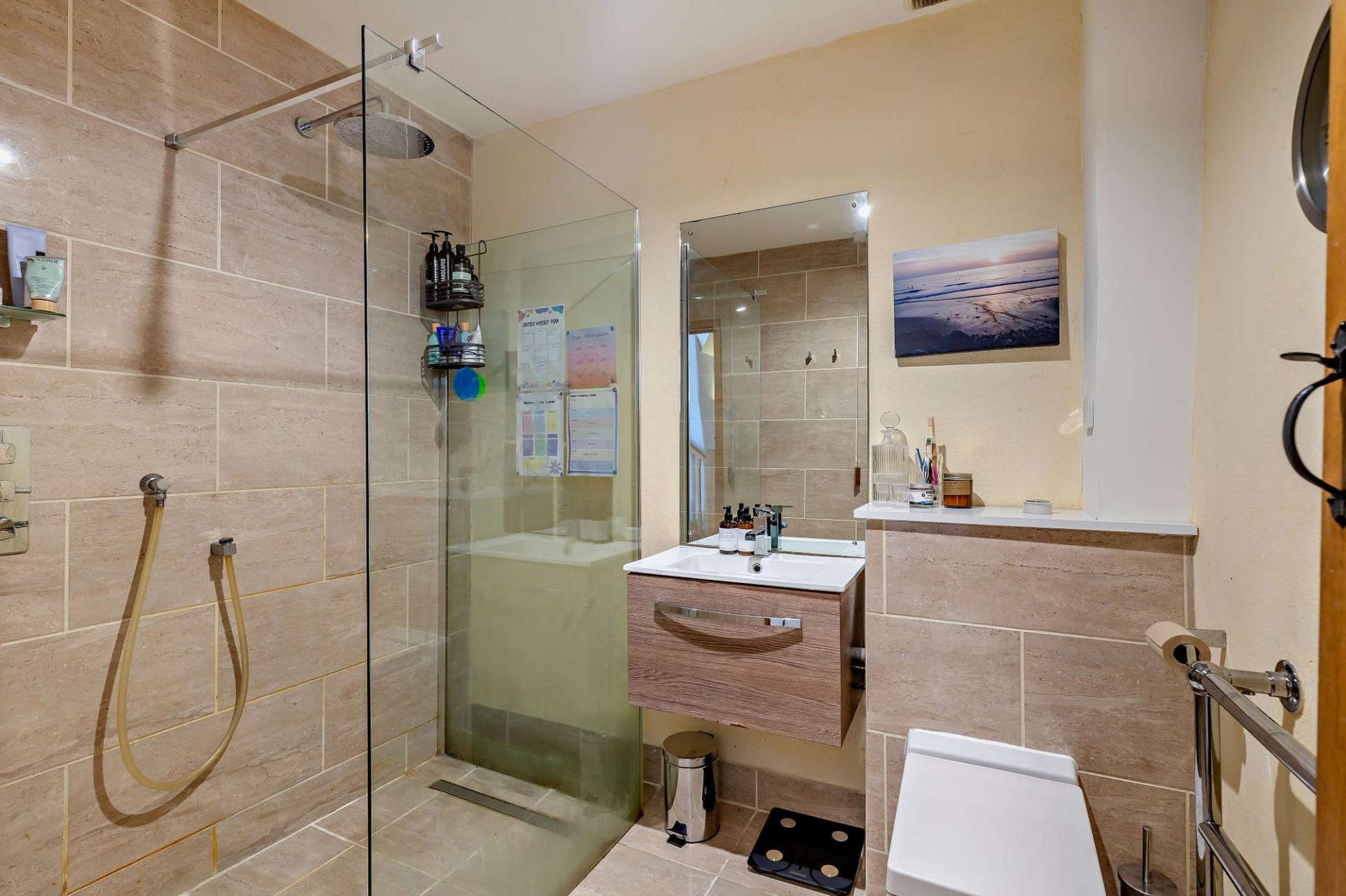The ensuite bathroom continues the home’s high standards, featuring a relaxing bath and a separate shower unit, all beautifully finished with neutral stone-coloured tiling, creating a serene and timeless atmosphere.