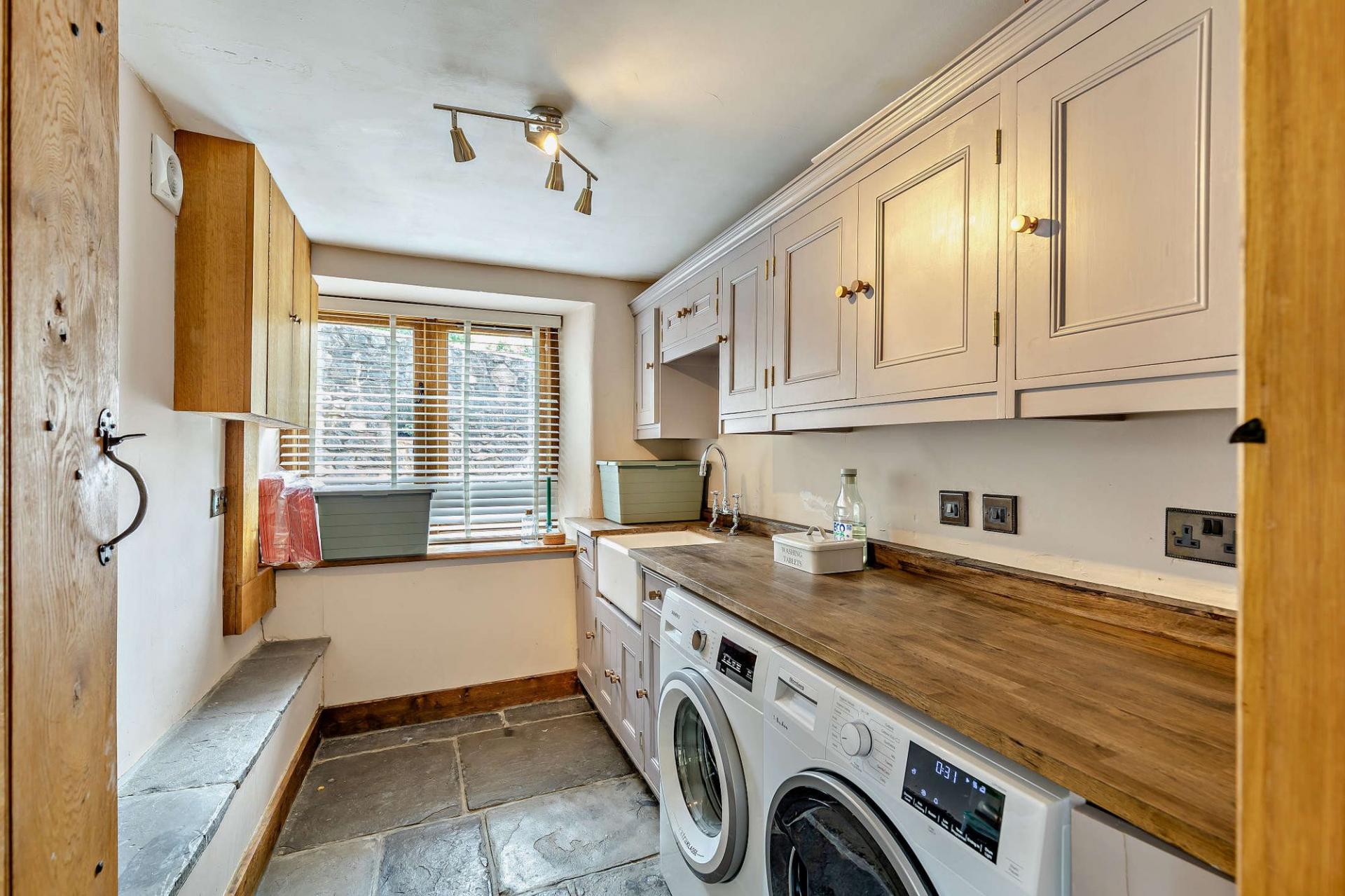 Off the hallway, a further cloakroom and a well-equipped utility room provide practical touches, featuring authentic York stone flooring, fitted cupboards, and plumbing for washing facilities.