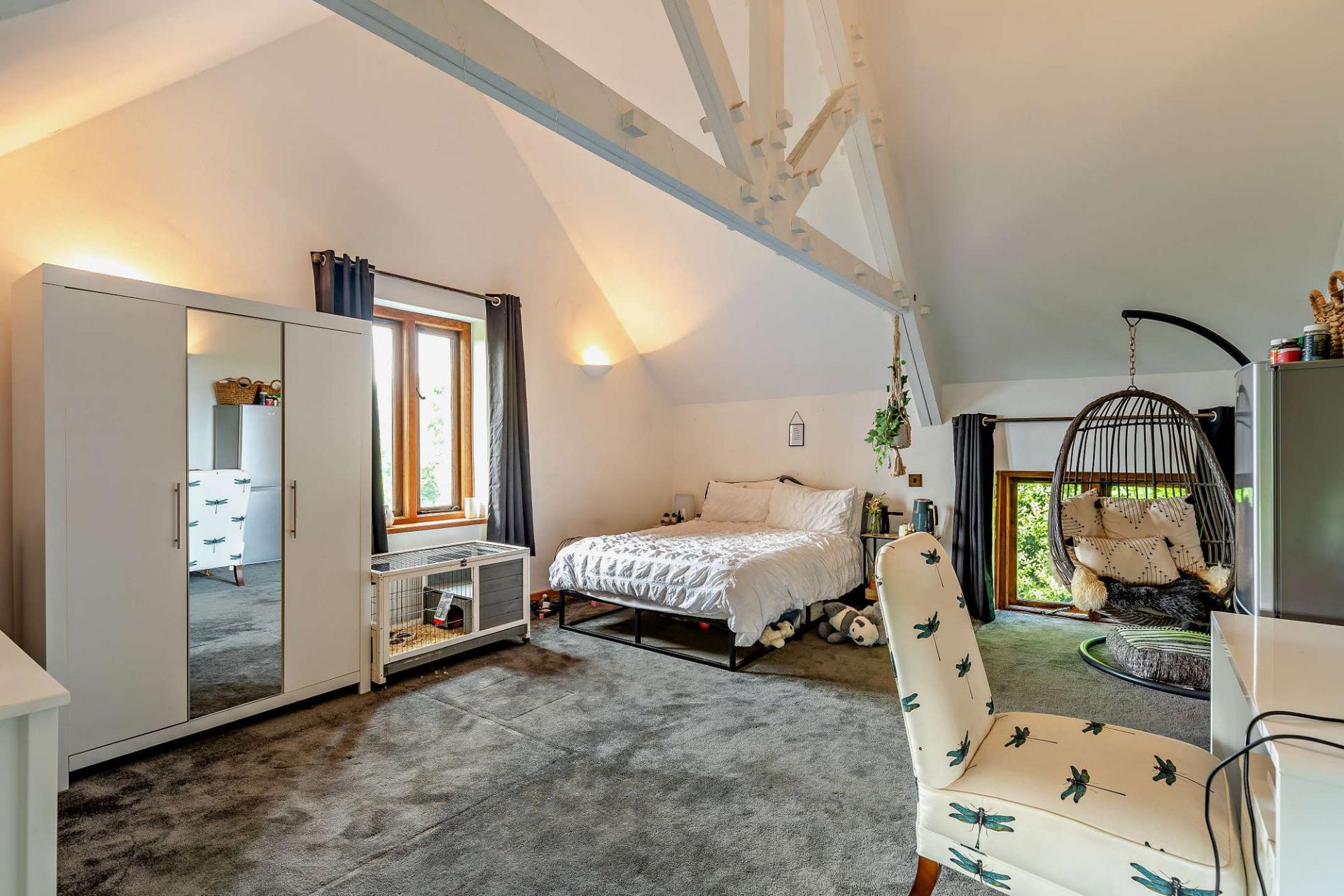 Bedrooms five and six are equally well-proportioned, both featuring charming mezzanine levels that add character and a sense of space. These rooms share an adjacent shower room, making them ideal for guests, family, or flexible living arrangements.