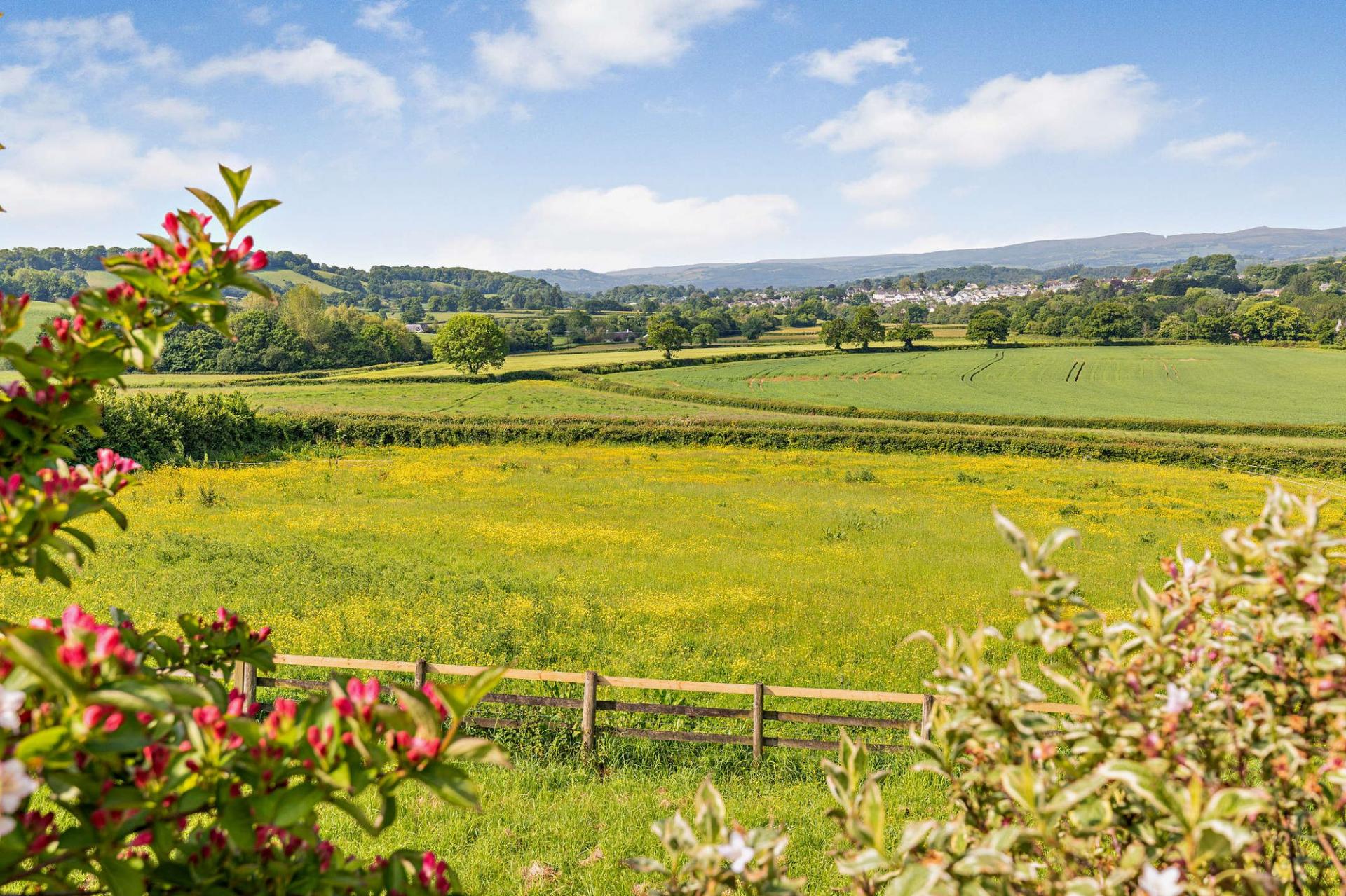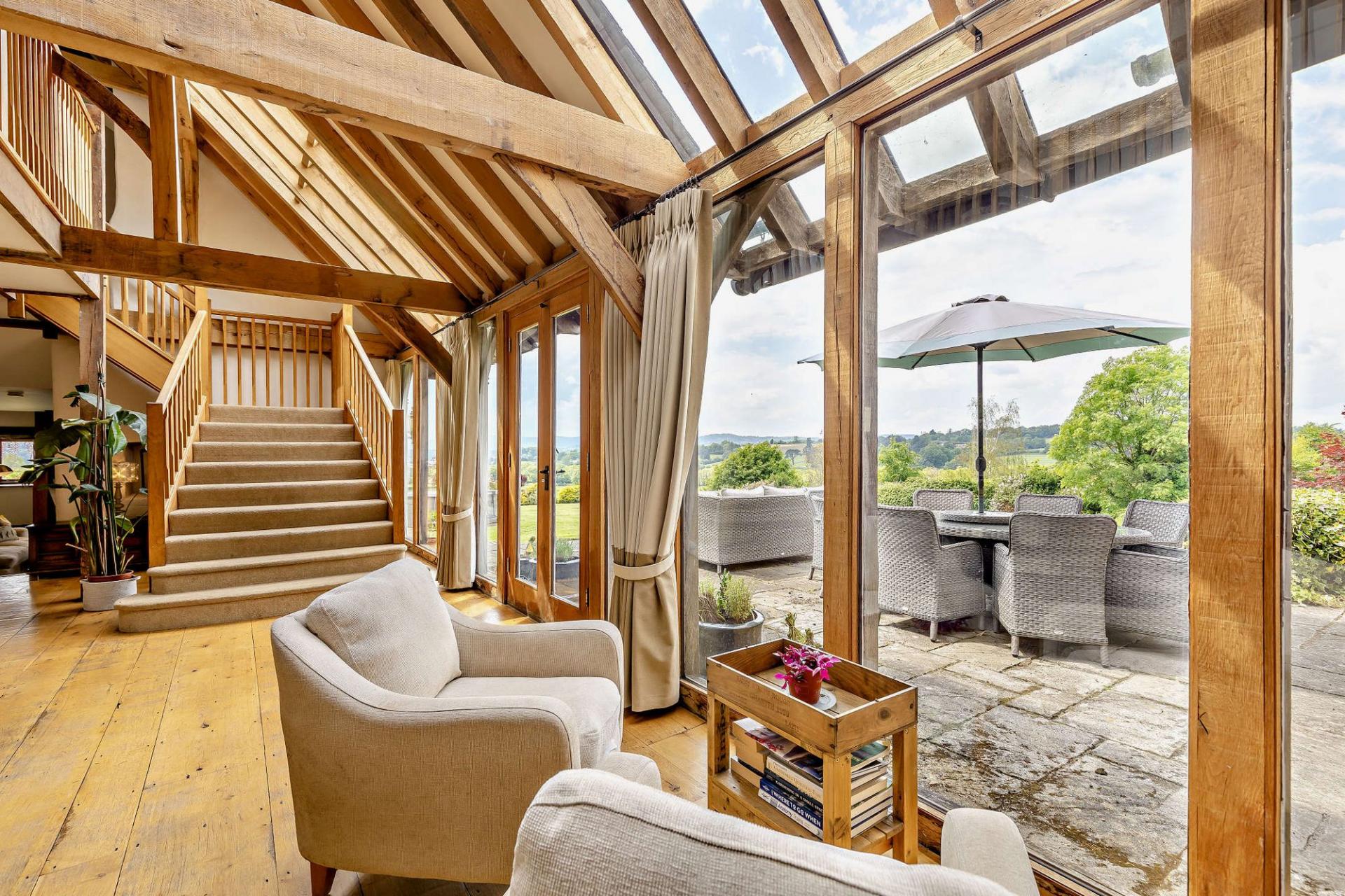 A striking, curved floor-to-ceiling window frames serene views of the side garden, while patio doors open onto the rear aspect, seamlessly connecting indoor and outdoor living and bringing the countryside views into the home.