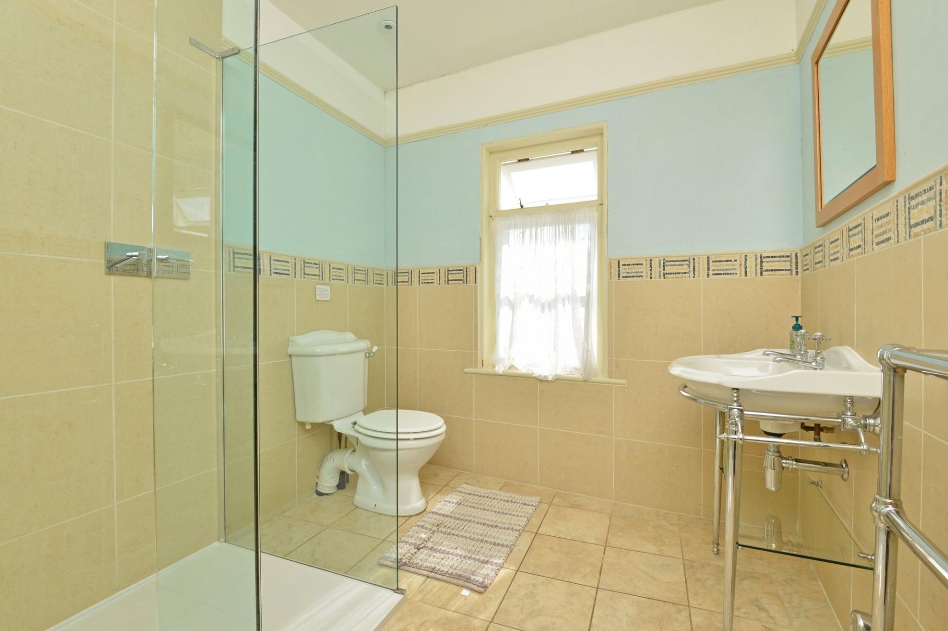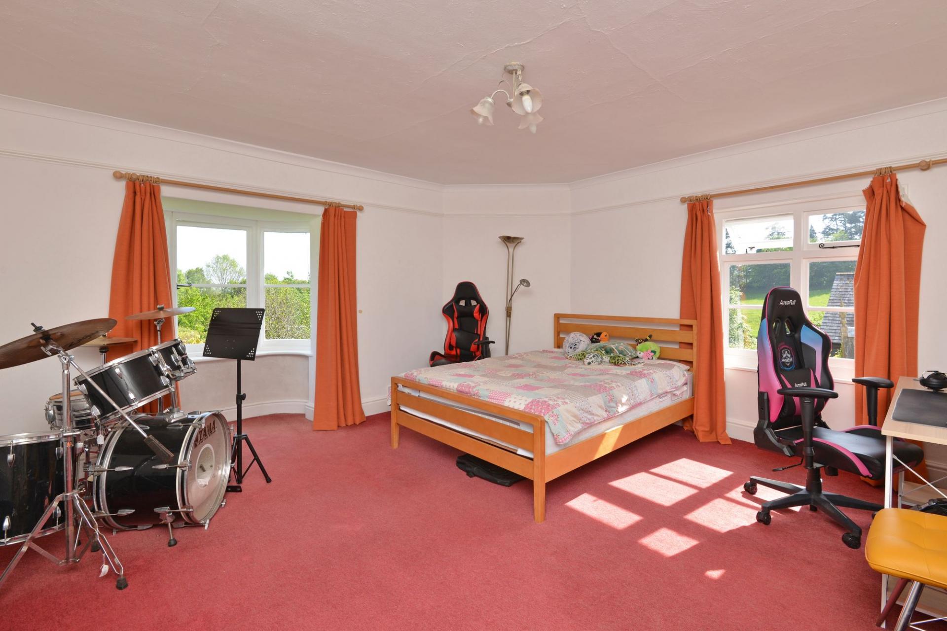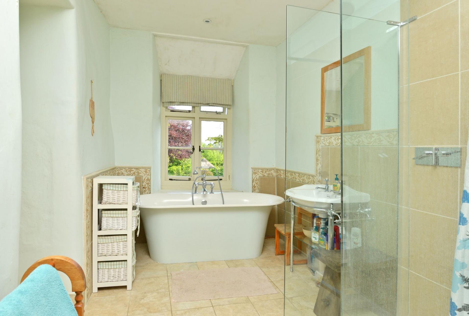 The principal bedroom is substantial, with built-in wardrobes and beautiful garden views. Its en-suite bathroom—also accessible from the landing—features a freestanding bath set before a picture window, a large walk-in shower, and charming curved walls, reflecting the property’s age and character.