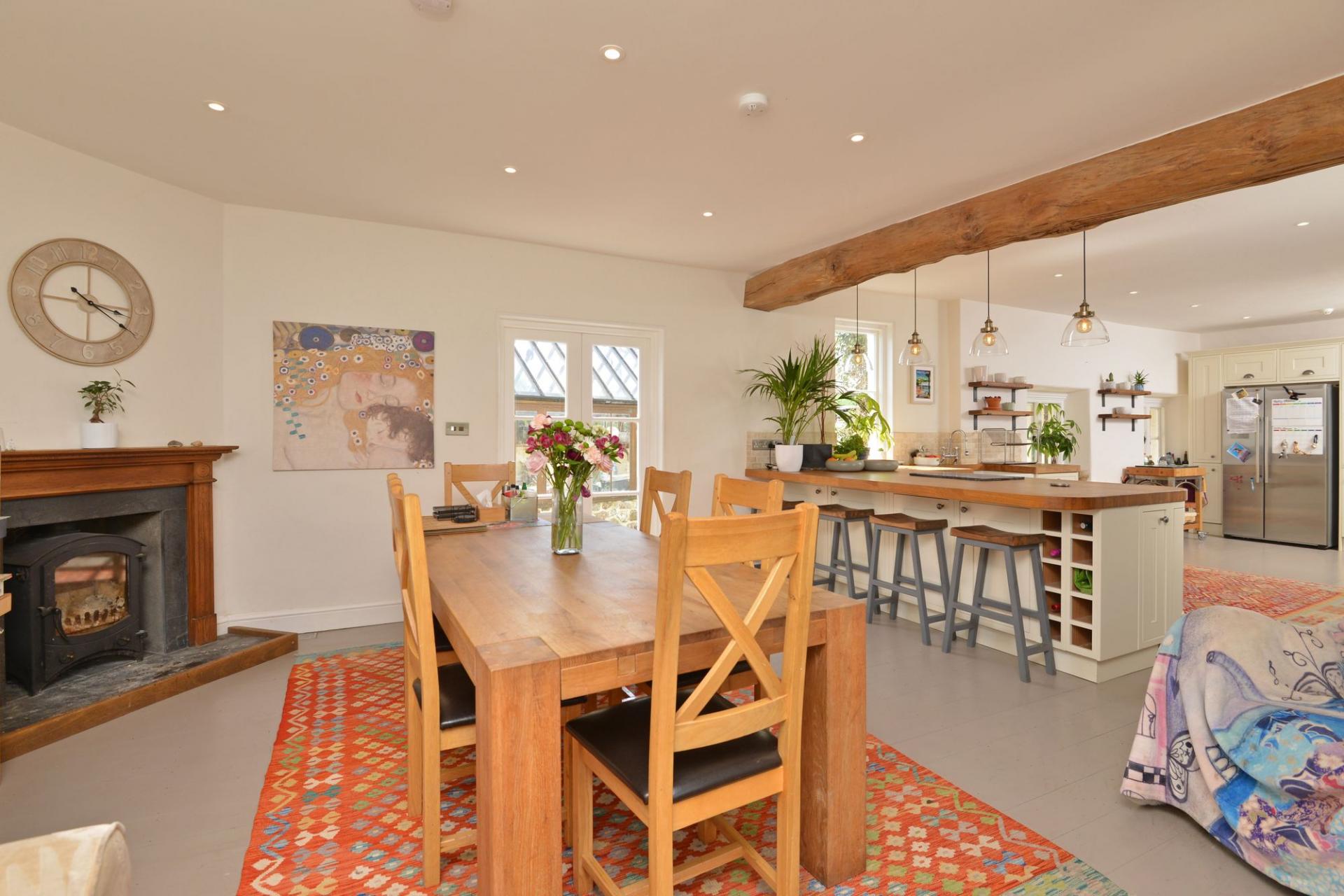 The kitchen is the heart of the home. Extended to create a luxurious cooking, dining, and entertaining space, it is designed with modern family life in mind. A box window overlooks the gardens, while French doors open onto a side patio leading to the greenhouse—perfect when cooking with fresh produce. A wood burner adds warmth and atmosphere in the cooler months.