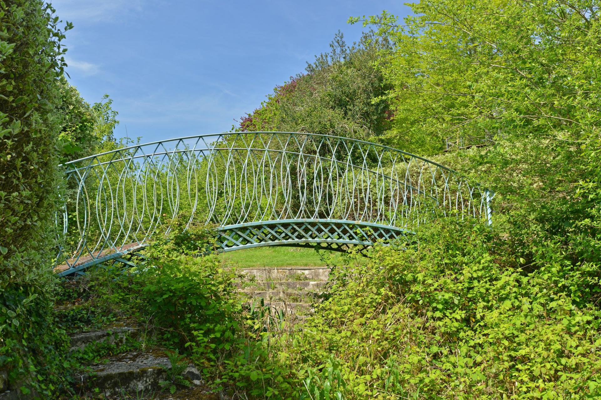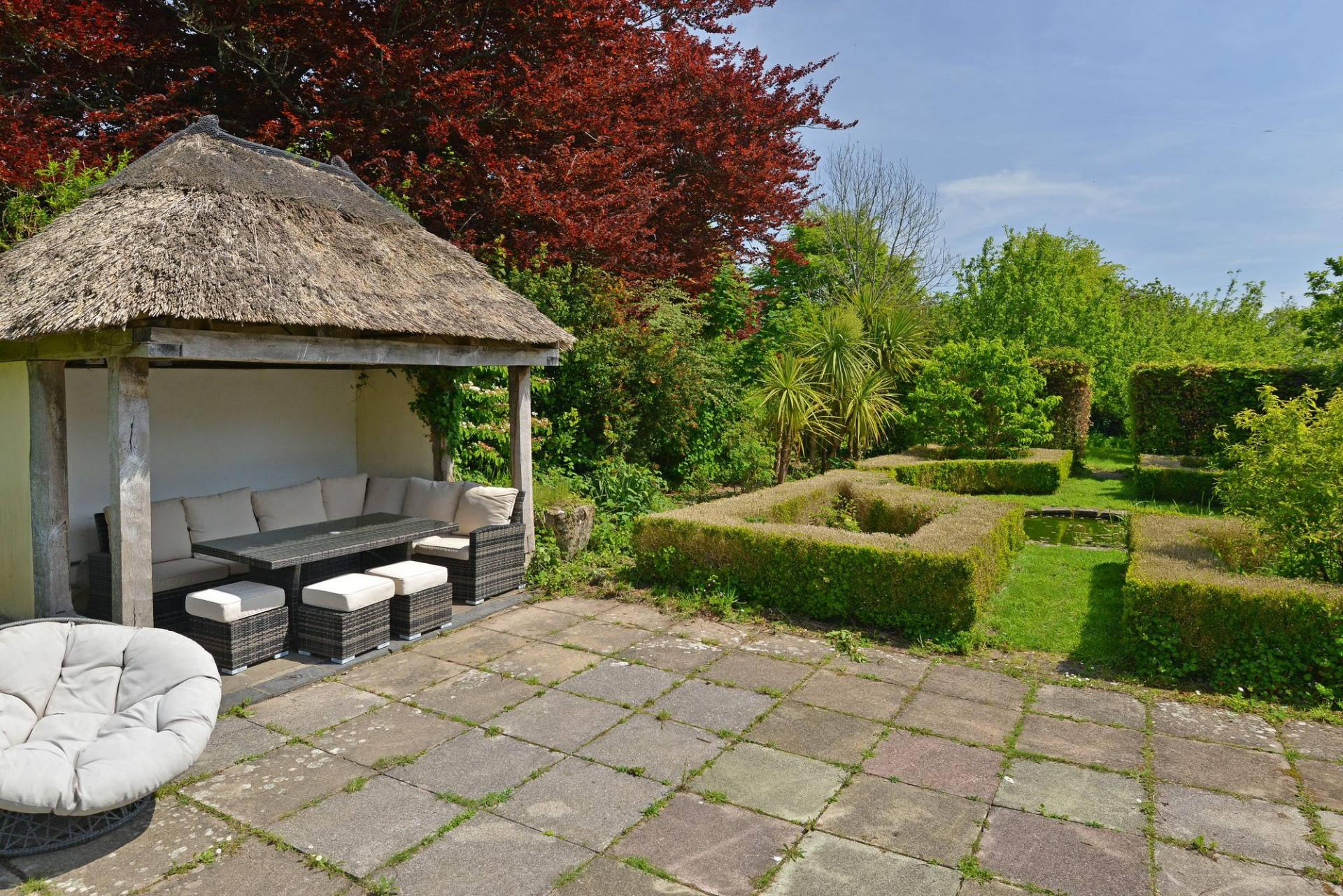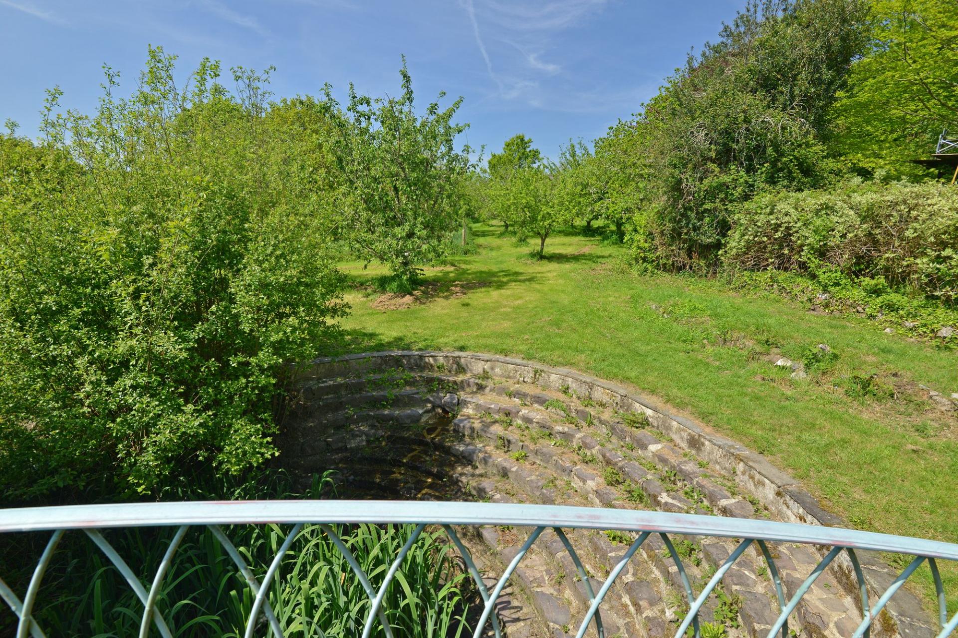 In one direction lies the site of a former swimming pool, now reimagined with a thatched roof structure used as a seating area with patio space and box hedging, perfect for gatherings. Stone steps create a charming amphitheatre-style feature, which has been used for events such as home education groups. A bridge over a lily pond continues the journey through the grounds, with hedging marking the boundaries and ensuring privacy.
