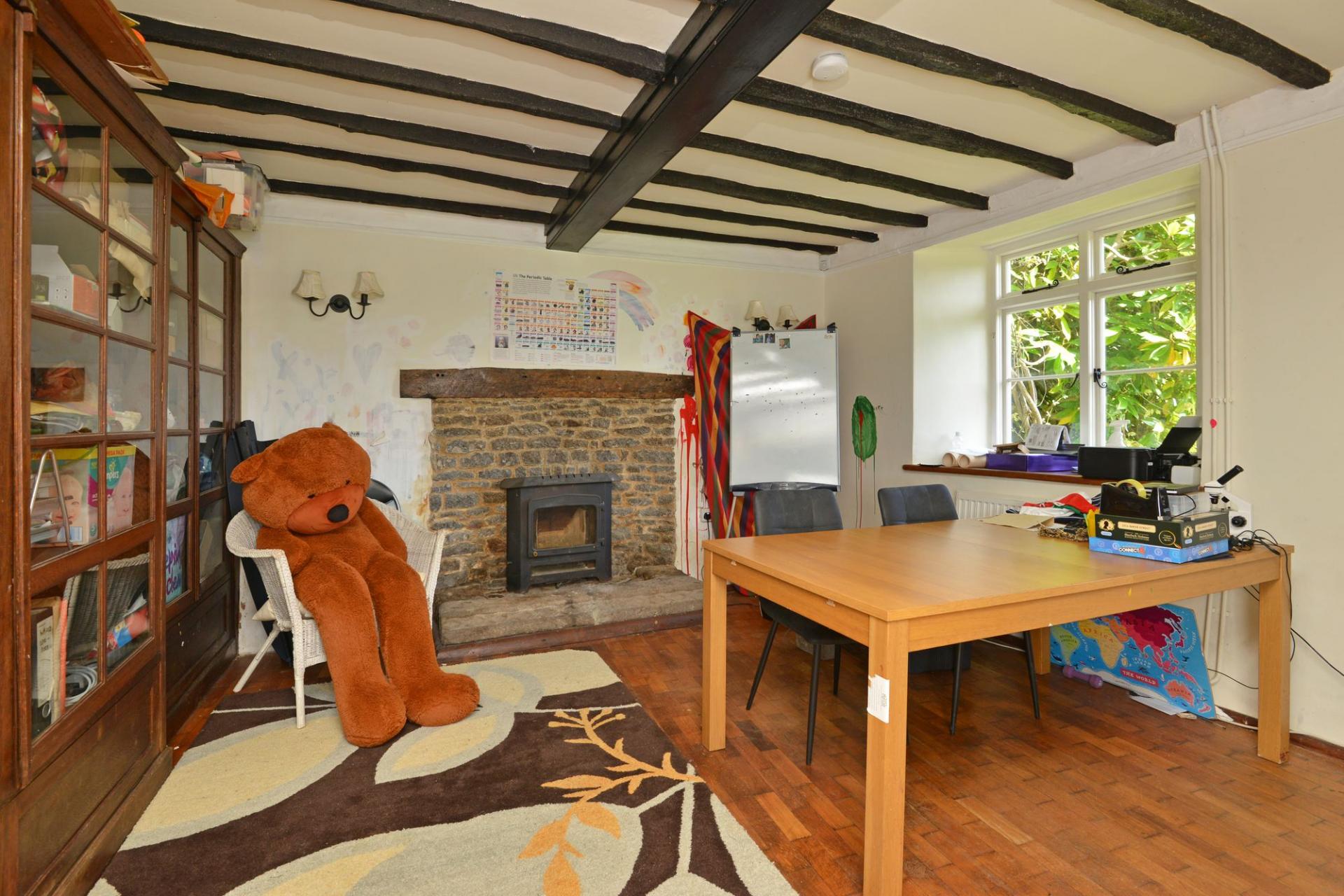 You enter into the dining room, where oak panelling sets a rich tone. From here, the accommodation flows into the living room, your eye immediately drawn to the impressive fireplace with large wood burner and parquet flooring. A third reception room showcases exposed wooden beams, adding to the farmhouse character.