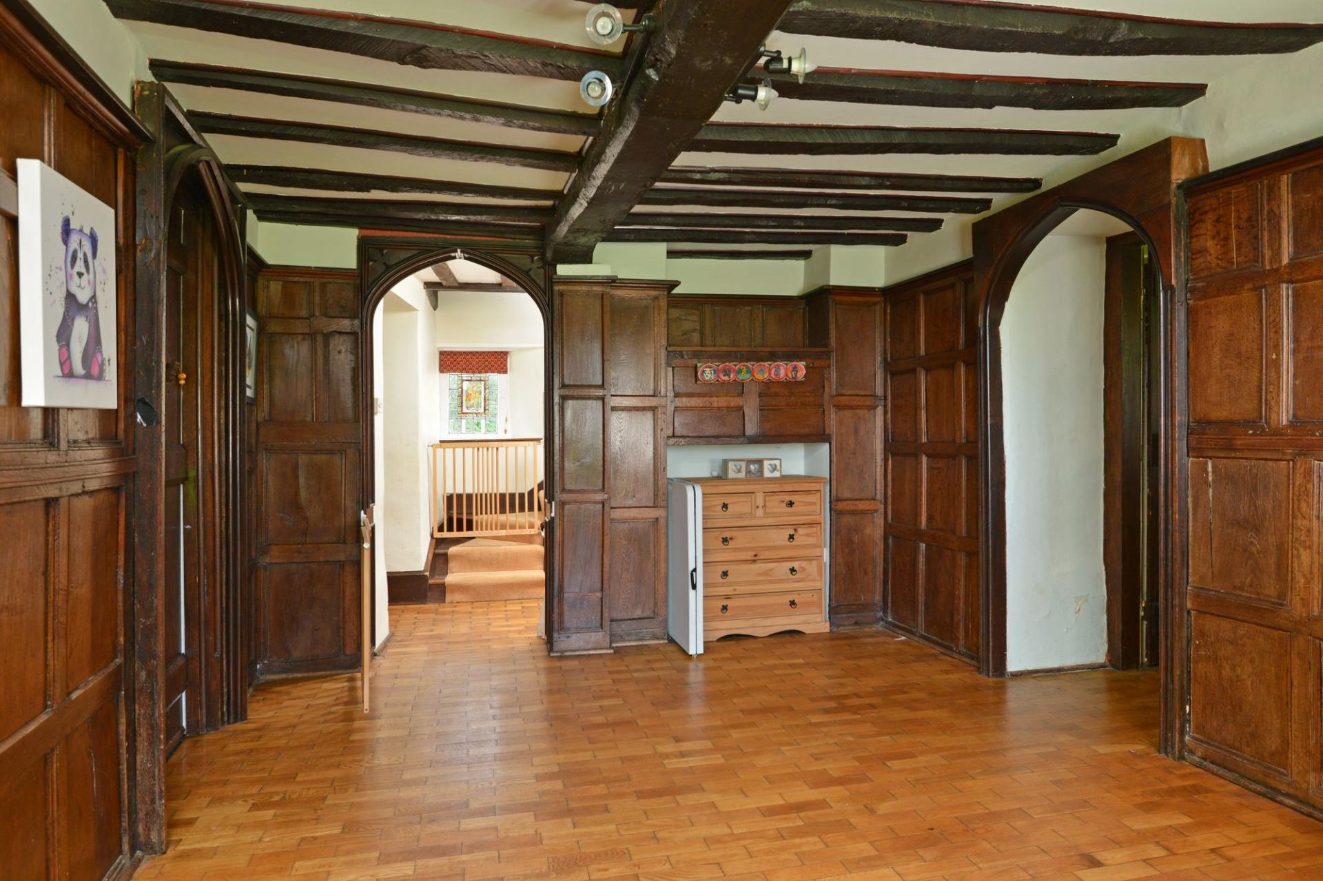 Upstairs, the sense of space continues. The first floor is arranged across both the original farmhouse and the later extension, linked by a wide, light-filled landing with wooden floors.
