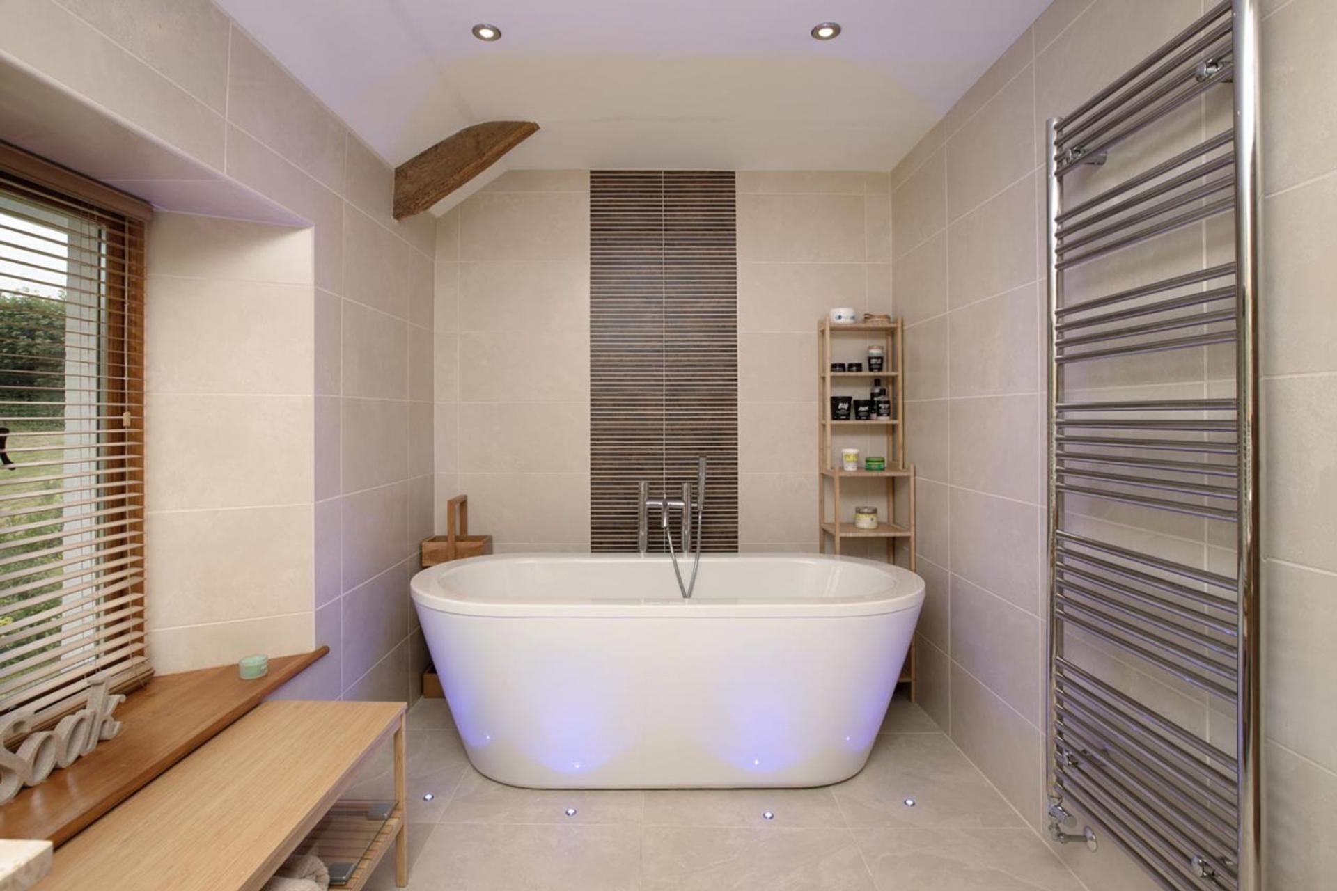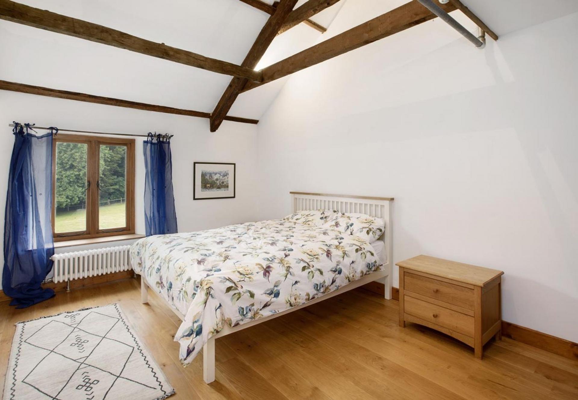 The principal suite is a private sanctuary—an expansive and refined retreat tucked into the far end of the home. A light-filled dressing room, lined with three double wardrobes, leads to a luxurious en-suite bathroom featuring a freestanding bath, oversized shower, and elegant contemporary finishes that honour the home’s classic roots. A few steps ascend to the bedroom itself, a dramatic space with vaulted ceilings, exposed beams, and dual-aspect windows that frame views of the gardens and surrounding landscape. It’s a room designed to inspire calm, comfort, and quiet luxury.