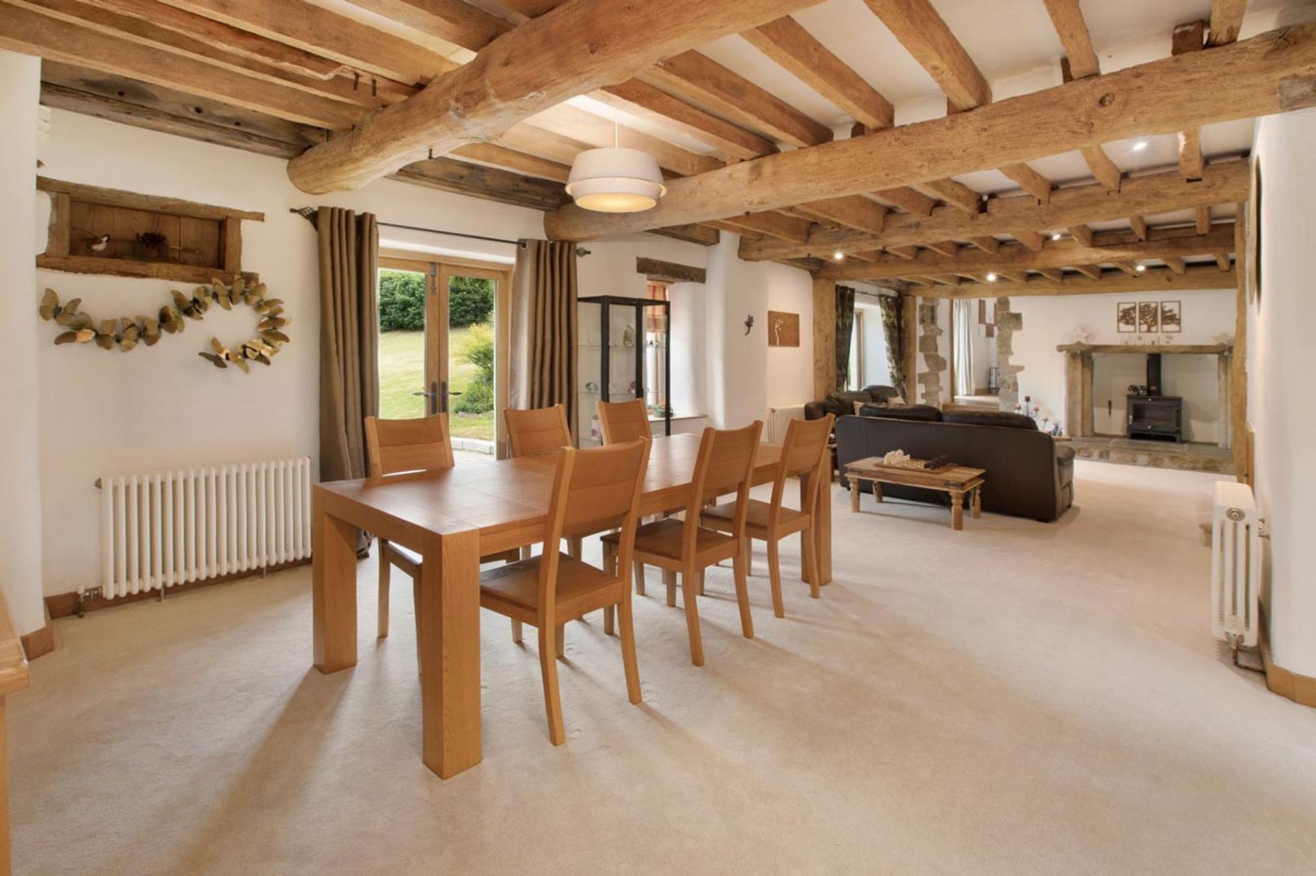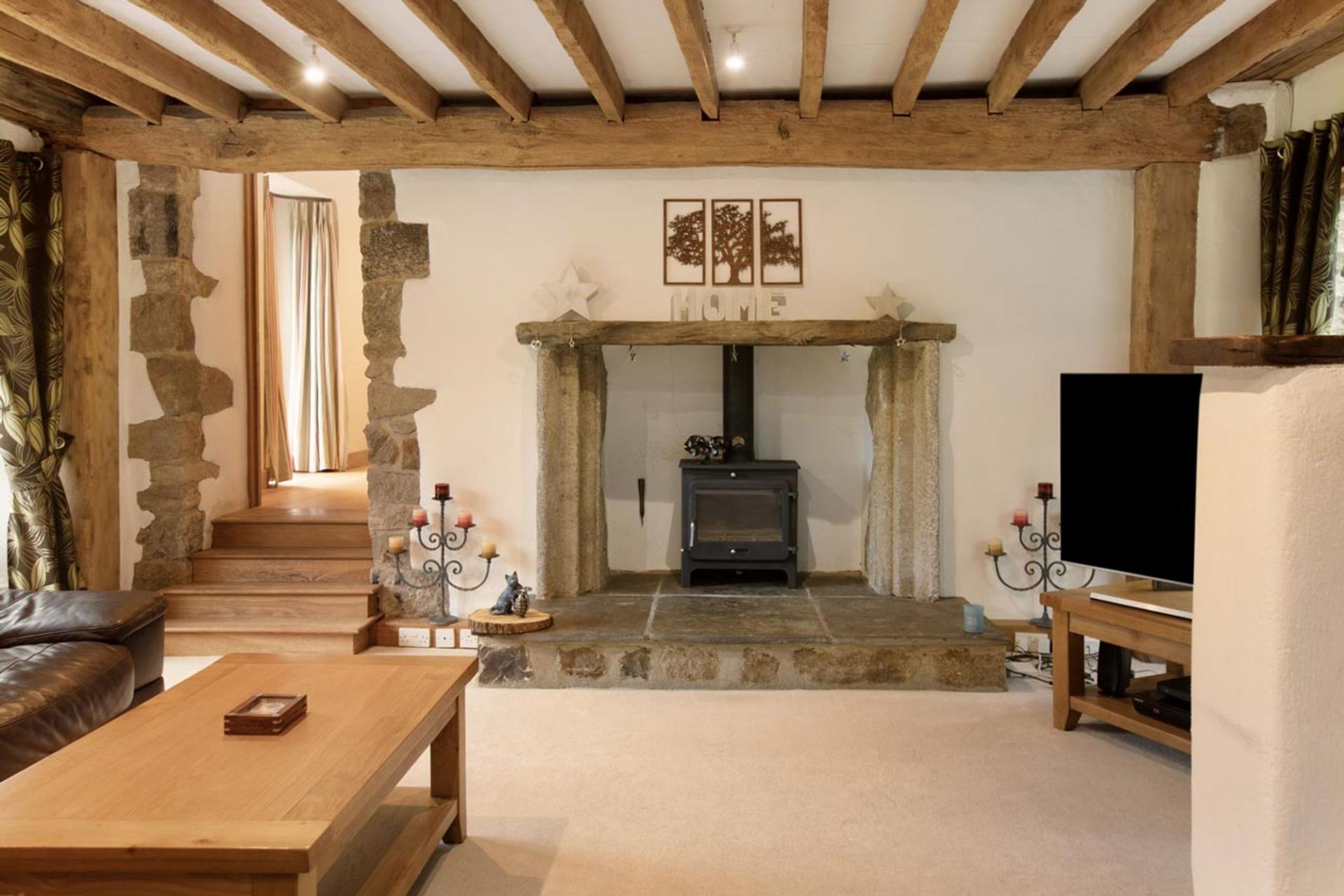 From the kitchen, a door leads into a spacious lounge, where original beams stretch across the ceiling and a wood-burning stove is framed by exposed granite and a hand-laid stone hearth. This is a room made for winter evenings and socialising, with double-aspect French doors continuing the home’s signature flow of light and openness.