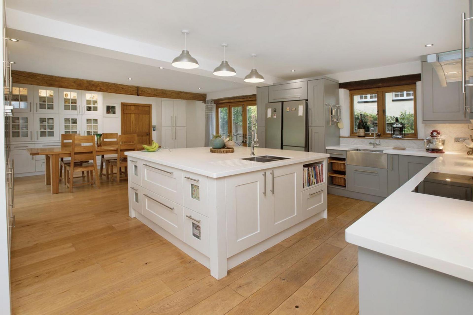 To the east of the grand entrance hall lies the true heart of the home—a spectacular kitchen/breakfast room where timeless craftsmanship meets thoughtful modern design. Anchored by a central island with crisp white worktops, a sunken sink, and cleverly integrated fridge drawers, this is a space created for both culinary artistry and relaxed family living. A breakfast bar invites casual gatherings, while contrasting cabinetry and sleek surfaces provide both elegance and practicality.