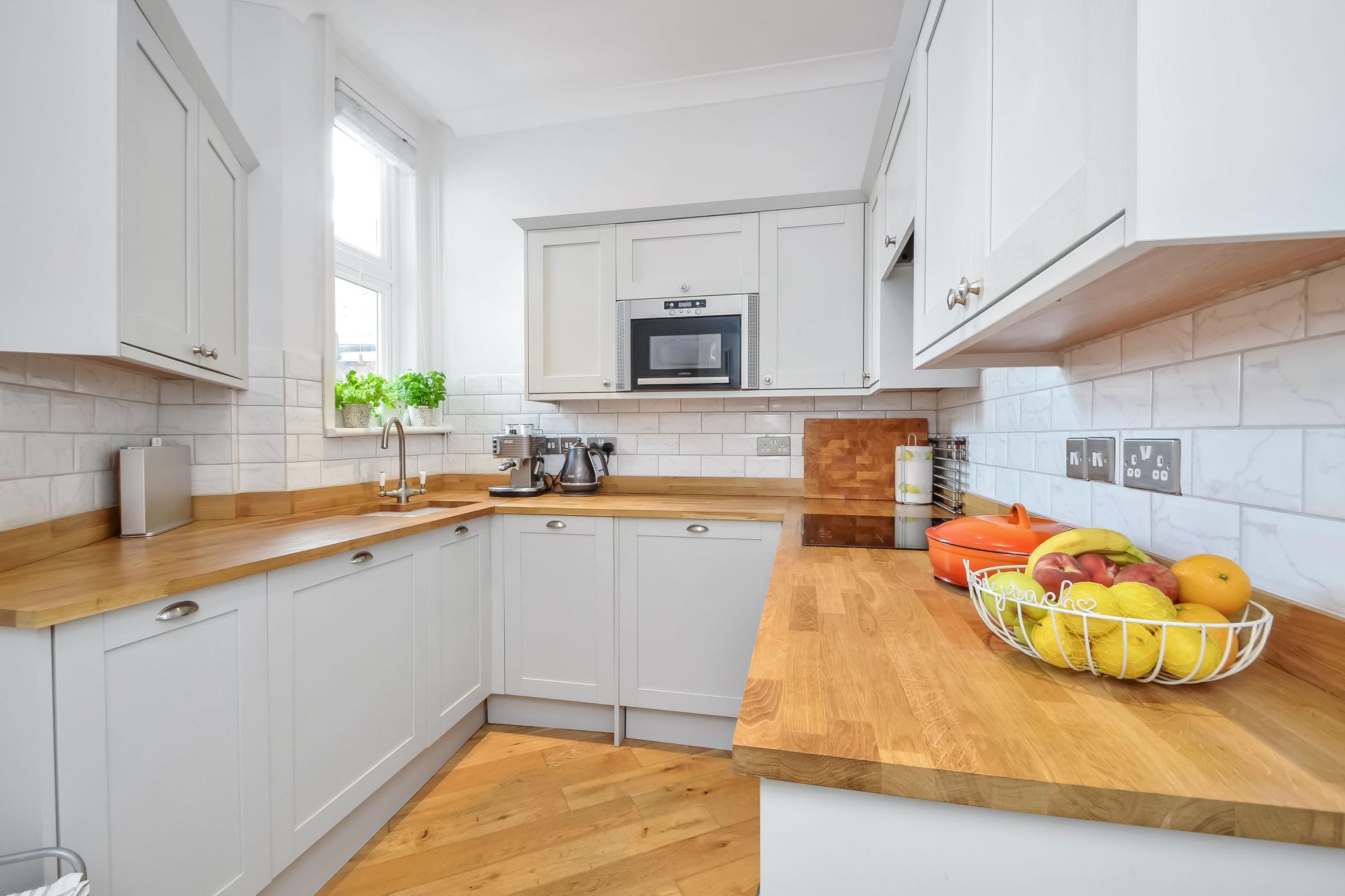 KITCHEN 8' 2" x 7' 8" (2.49m x 2.34m) Range of matching wall and floor units with wood block work surface, inset 1½ bowl sink unit with mixer tap, wooden splashback, tiled surrounds, double glazed window to side aspect, eye-level microwave with cupboards to either side and over, inset four ring electric hob with oven under, and extractor hood, fan and light over, brush steel fronted power points, range of drawer units, integrated fridge, freezer, slimline dishwasher and washing machine with matching doors, matching flooring, high ceiling with coving and spotlights.