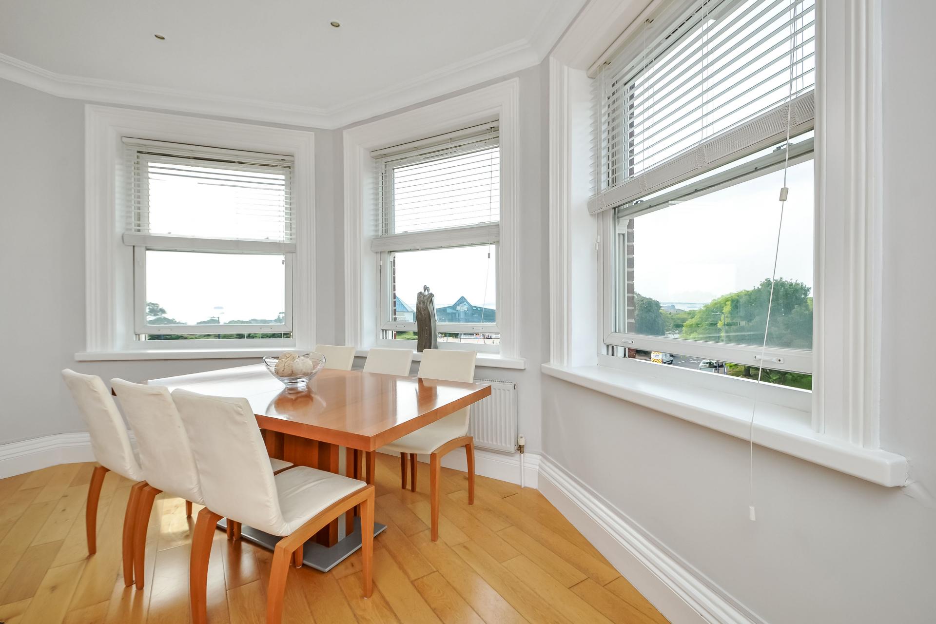 DINING ROOM / SITTING ROOM 28' 0" maximum x 23' 6" (8.53m x 7.16m) Matching wooden flooring, range of sash windows to front and side aspect with shutter blinds and outstanding views over Southsea Common, the Solent, Napoleonic Forts and the Isle of Wight in the distance, ceiling coving and spotlights, three double radiators, high level built-in cupboard with electric consumer box, high skirting boards, small study area.