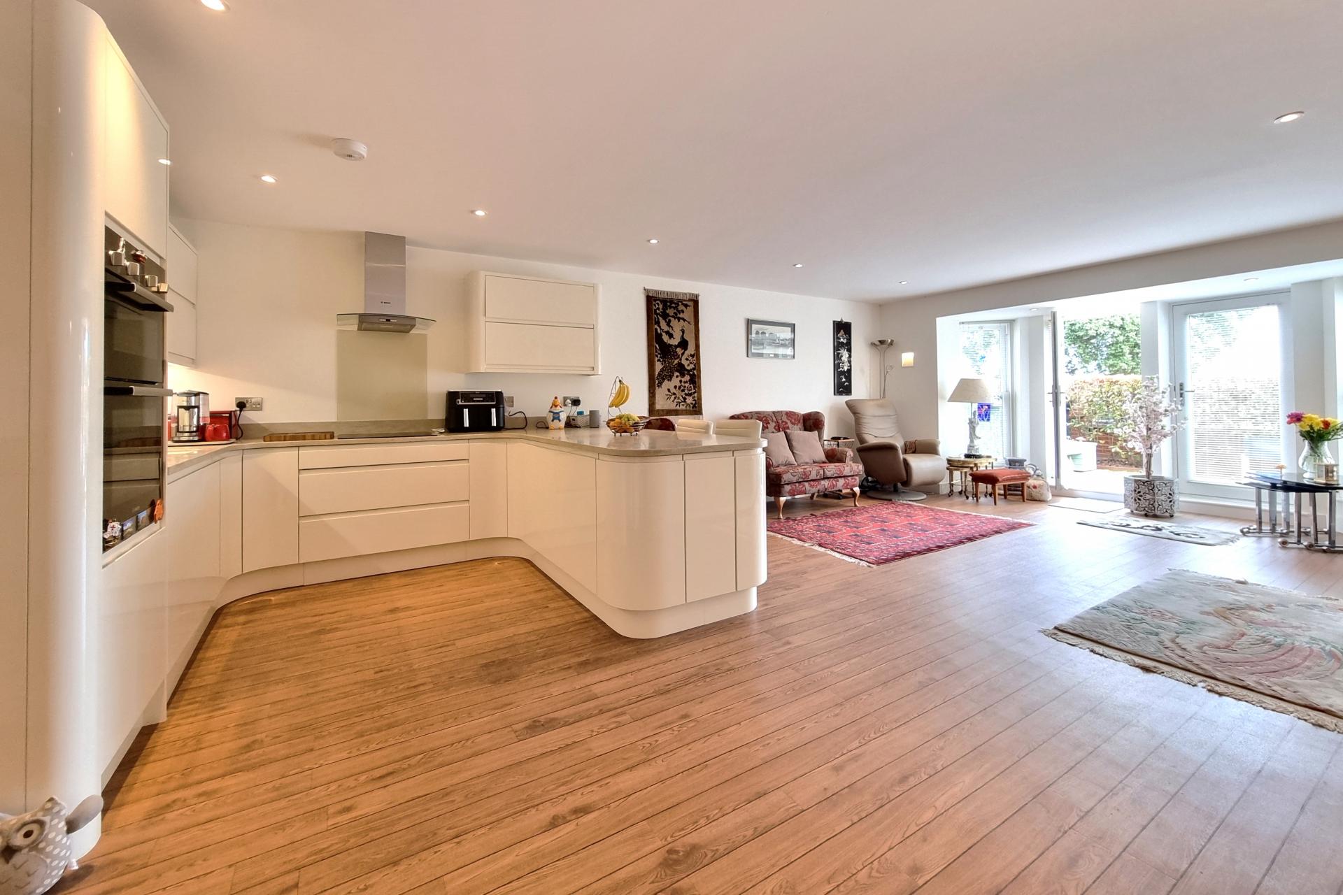 Kitchen area: Comprehensive range of cream fronted wall and floor units with Corian work surface, inset 1½ bowl sink unit with mixer tap and drainer to one side, corner curved unit, under unit lighting, eye-level Bosch microwave, integrated Neff dishwasher, eye-level Bosch oven and grill with storage cupboards over and under, range of pan drawers, Amtico flooring, peninsular breakfast bar divide incorporating fridge and freezer under with matching doors, inset Bosch induction hob with glass splashback, extractor hood, fan and light over, ceiling spotlights and wall lights, entry phone system, controls for underfloor heating, door to: