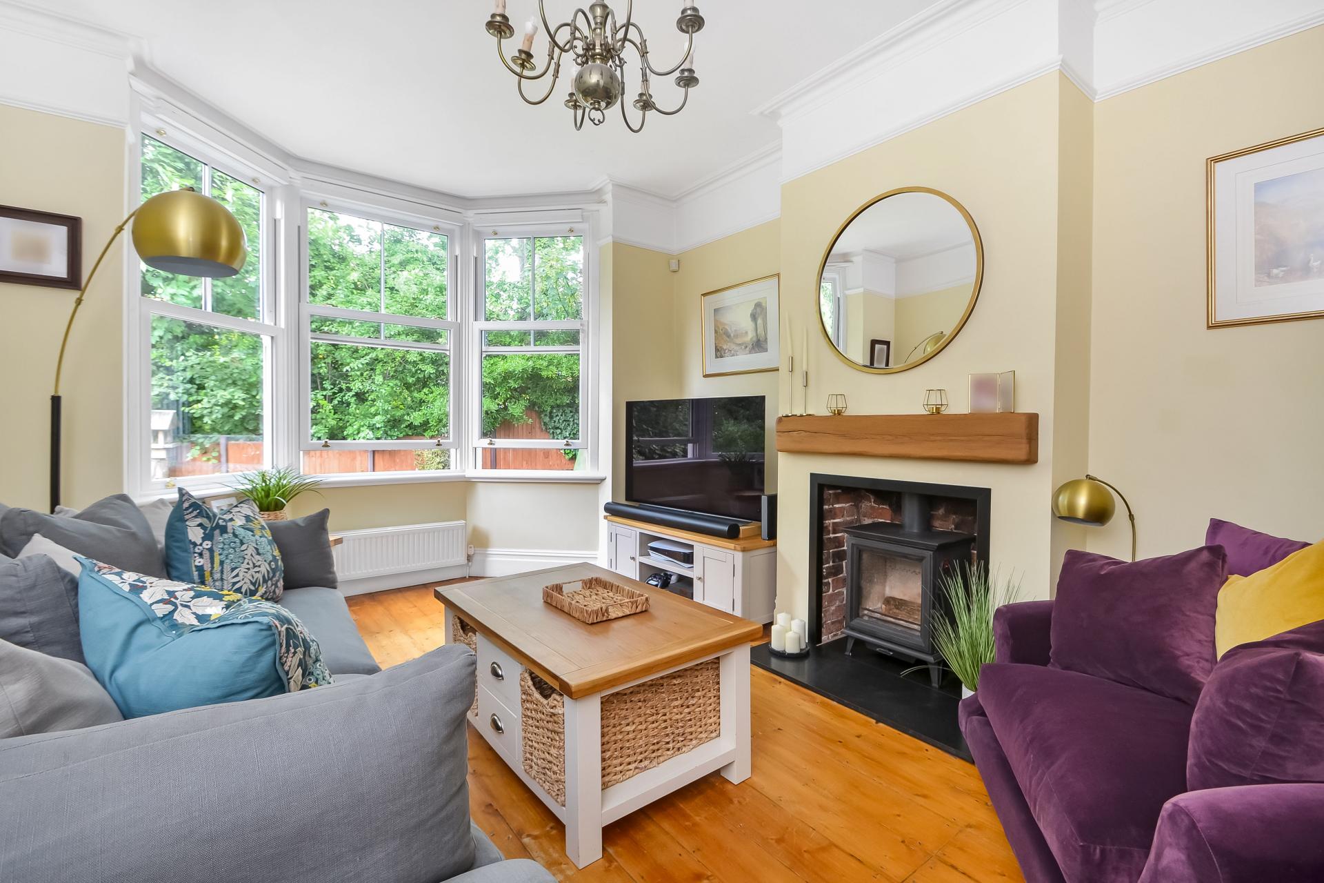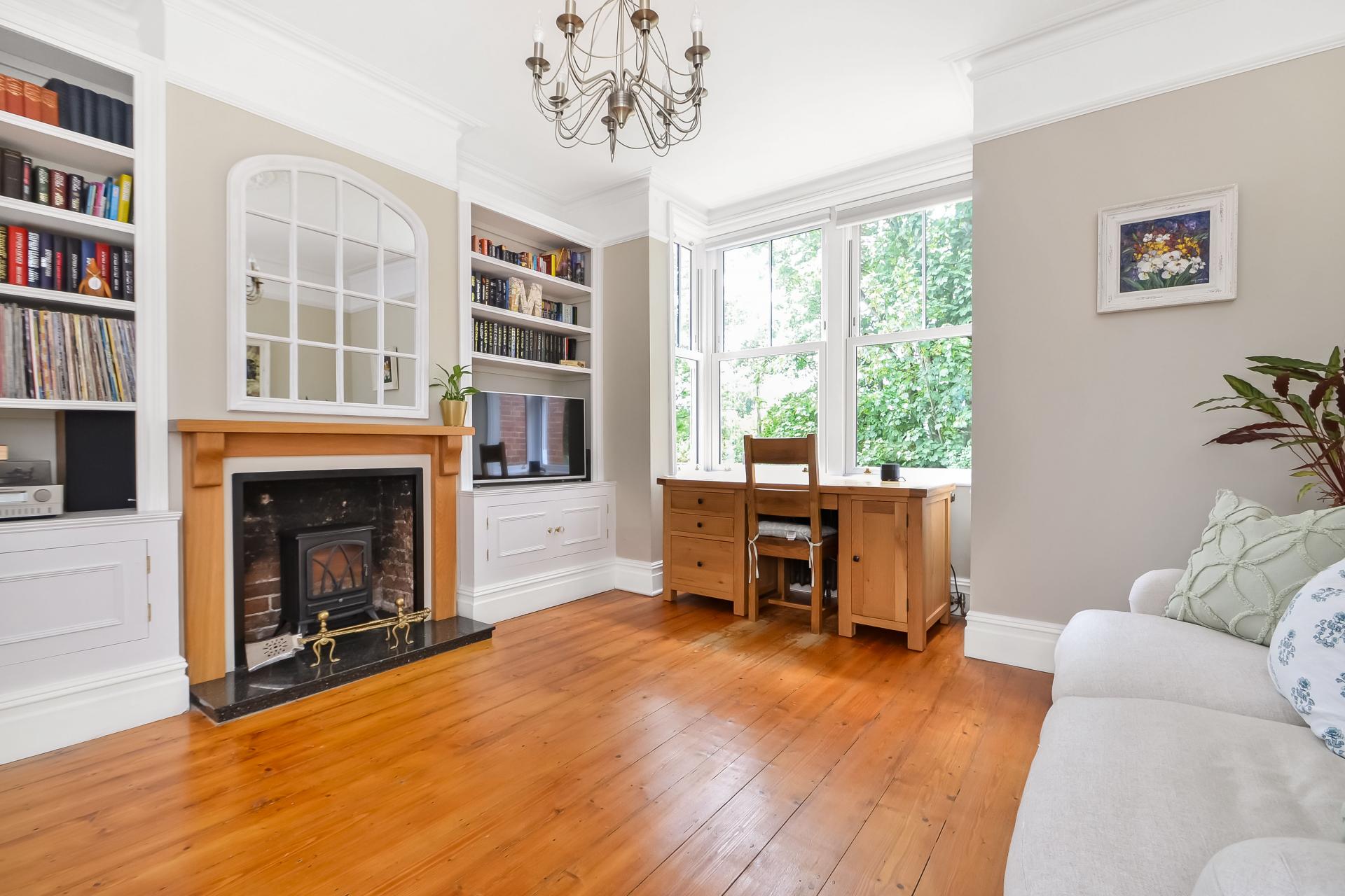 SITTING ROOM 15' 11" into bay window x 12' 0" (4.9m x 3.66m) Double glazed sash bay window overlooking garden with radiator under, stripped and stained floorboards, central chimney breast with wooden mantle, exposed brick inlay and log burner, roll top radiator, panelled door, picture rail, ceiling coving, dimmer switch.