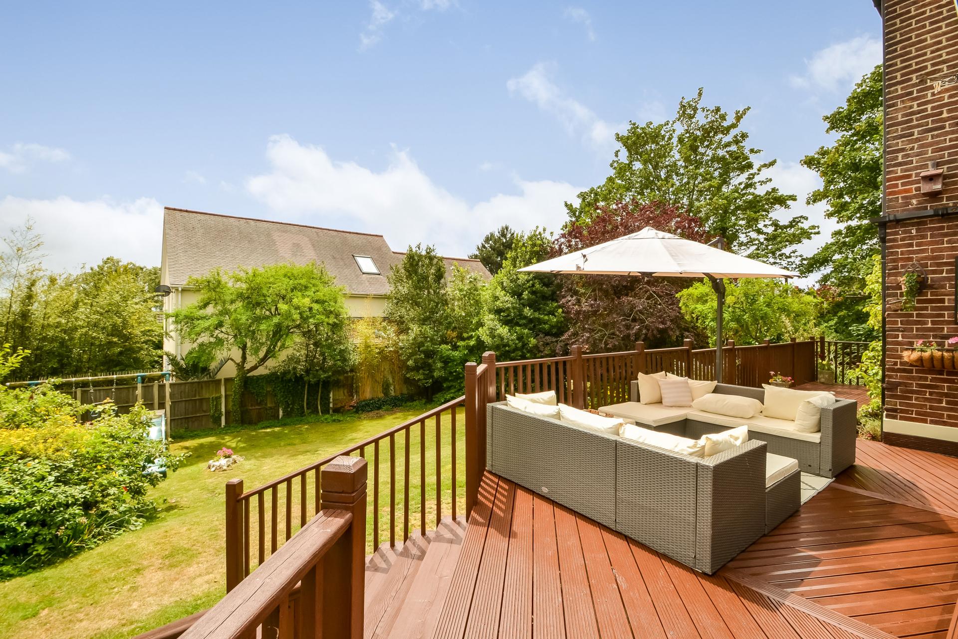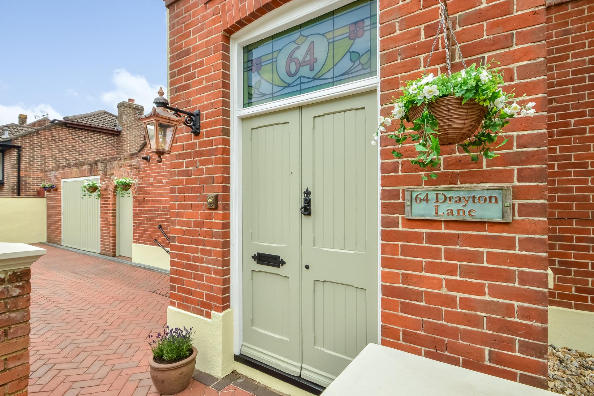 OUTSIDE To the left hand side of the property is car hardstanding for one car with brick archway and pedestrian gate leading to side access, cold water tap, door to lobby, door to garage, brick paviour pathway leading to raised decked area wrapping to the rear of the property and bi-folding doors from dining area, balustrade and wooden steps leading down to split-level primary lawned garden, storage space under decking, covered log store, the garden is enclosed by fence panelling and brick retaining wall, mature shrubs, evergreens and bushes, the garden wraps round to the Drayton Lane side of the house which has lawn with gated entrance to the front, garden shed.