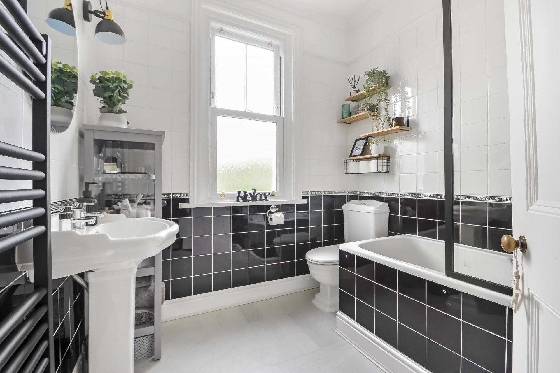 BATHROOM White suite comprising: panelled bath with mixer tap and shower attachment, drench style hood and screen, close coupled w.c., pedestal wash hand basin, circular mirror with lighting either side, heated towel rail, frosted double glazed sash window to front aspect, ceramic tiled to walls, vinyl flooring.