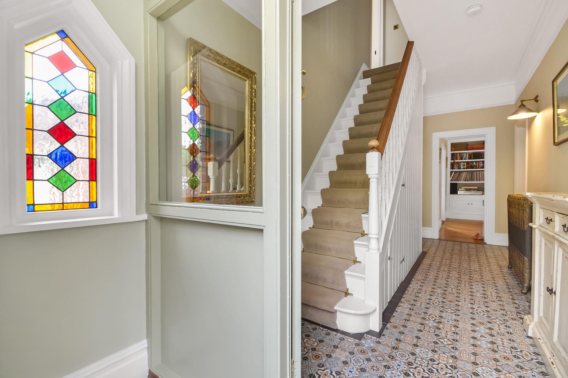 HALLWAY Ceiling coving, picture rail, high skirting boards, feature architraves, roll top radiator, quarry tiled flooring, understairs storage cupboard, balustrade staircase rising to first floor, further deep understairs cupboard with electric meter, doors to primary rooms.