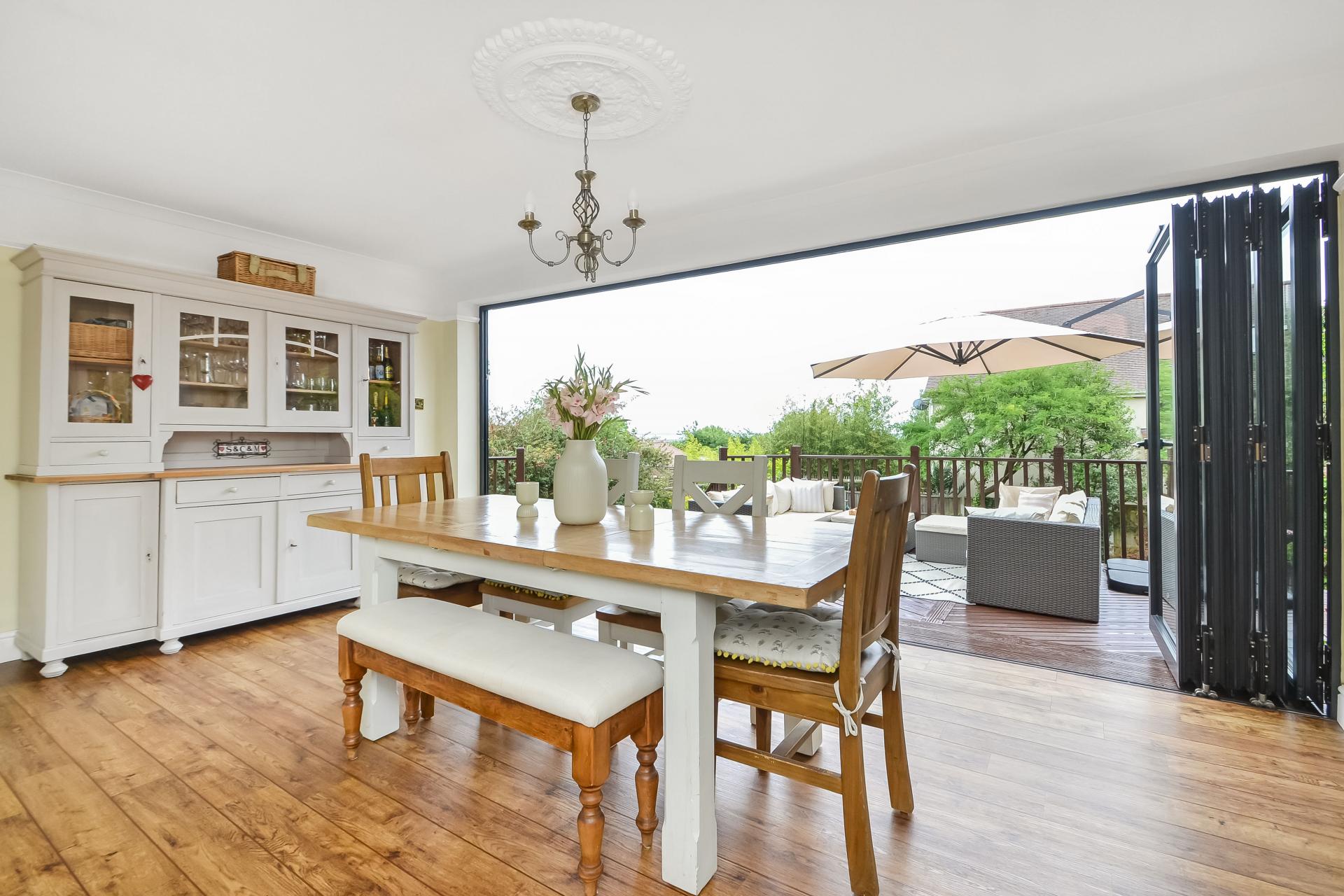 DINING ROOM 18' 1" x 9' 3" (5.51m x 2.82m) Twin glazed doors leading to living room, full width bi-folding doors leading to raised decked area with far reaching views towards Langstone Harbour and Hayling Island in the distance, ceiling coving and rose, picture rail, Polyflor high quality vinyl flooring with electric underfloor heating, , square opening leading to: