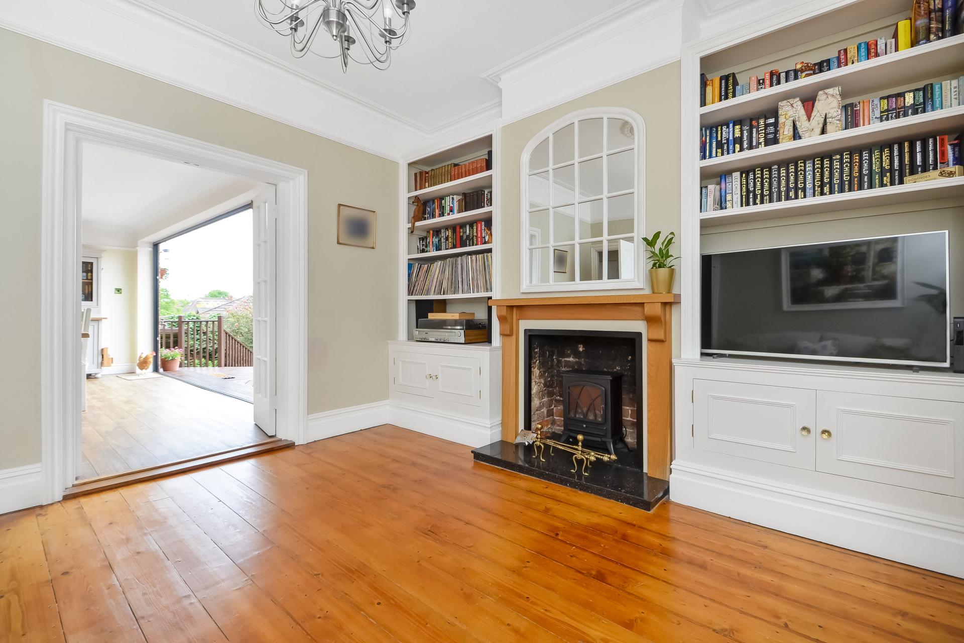 FAMILY ROOM 14' 6" into bay window x 14' 0" (4.5m x 4.27m) Double glazed square bay window to side aspect with blinds overlooking garden, roll top radiator under, stripped and stained floorboards, central chimney breast with wooden surround fireplace, brick inlay and granite hearth, built-in cupboards to either side of chimney breast with shelving over, twin glazed doors leading to dining room, ceiling coving and rose, dimmer switch, picture rail.