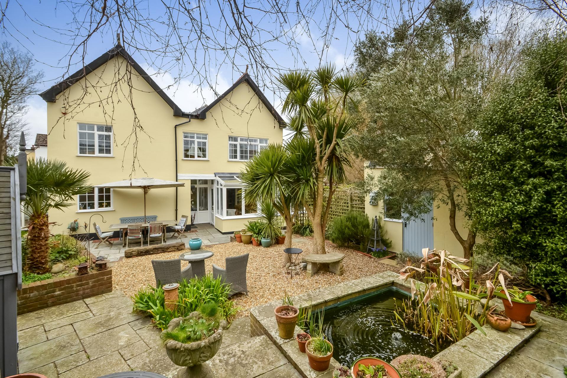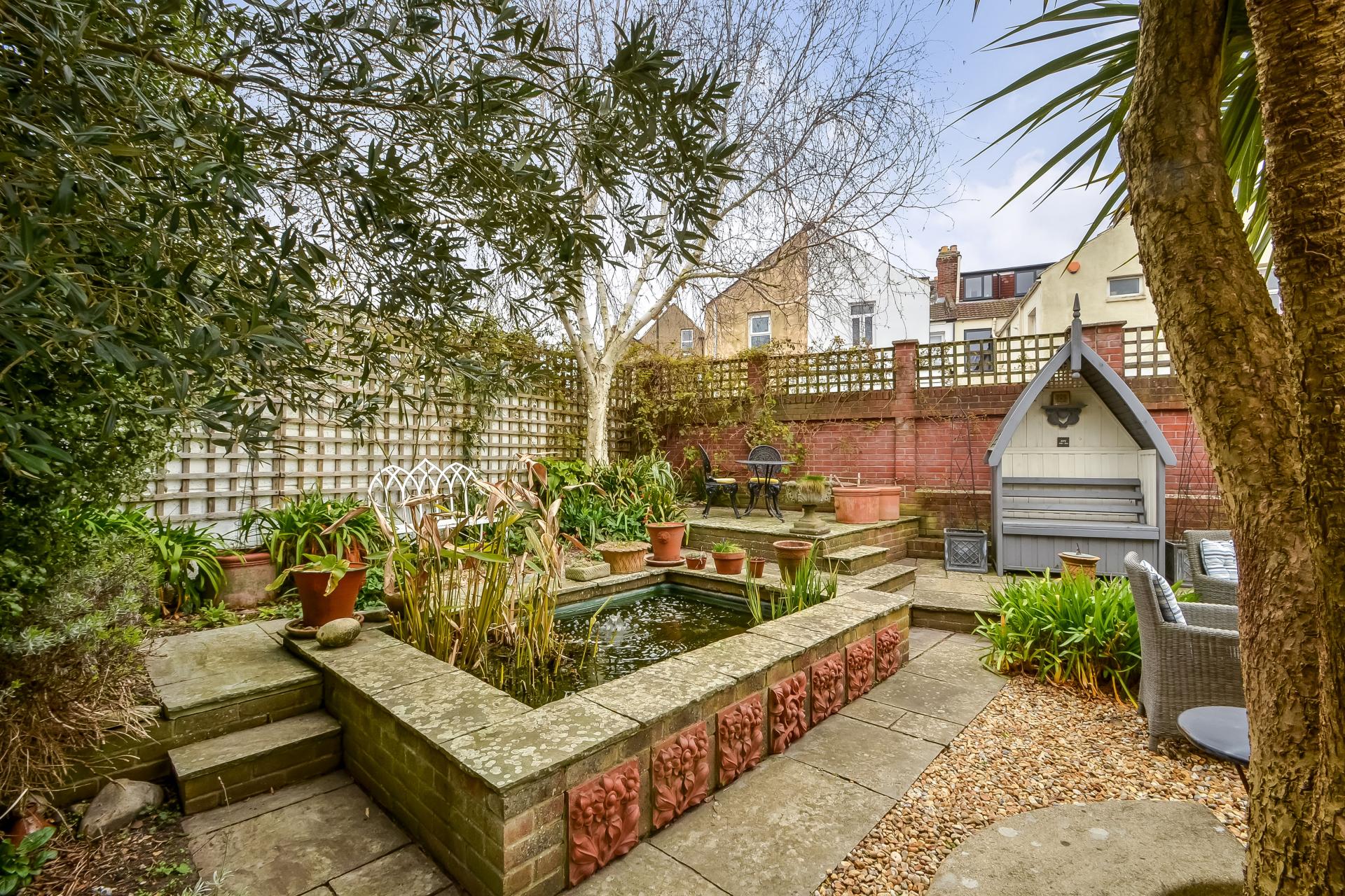 OUTSIDE Access to main front door via garden / dining room, access to garage with Indian sand stone patio area in front, irregular recessed area with tree and log store, wooden built garden shed. The primary garden is on the left hand side of the property and is laid to paving with access to both the garden / dining room and kitchen. The garden wraps round to the rear of the property, rear pedestrian gate, raised brick retaining walls featuring terracotta panels with shrubs, evergreens and bushes, further wall and trellis, large shingled area, step leading up to raised patio area, seating and fish pond, cold water tap.