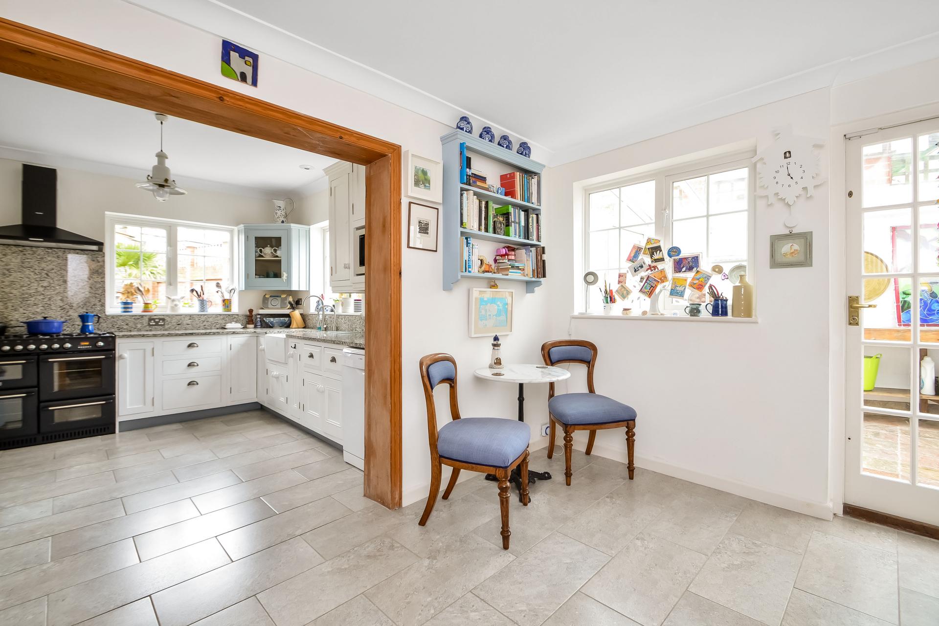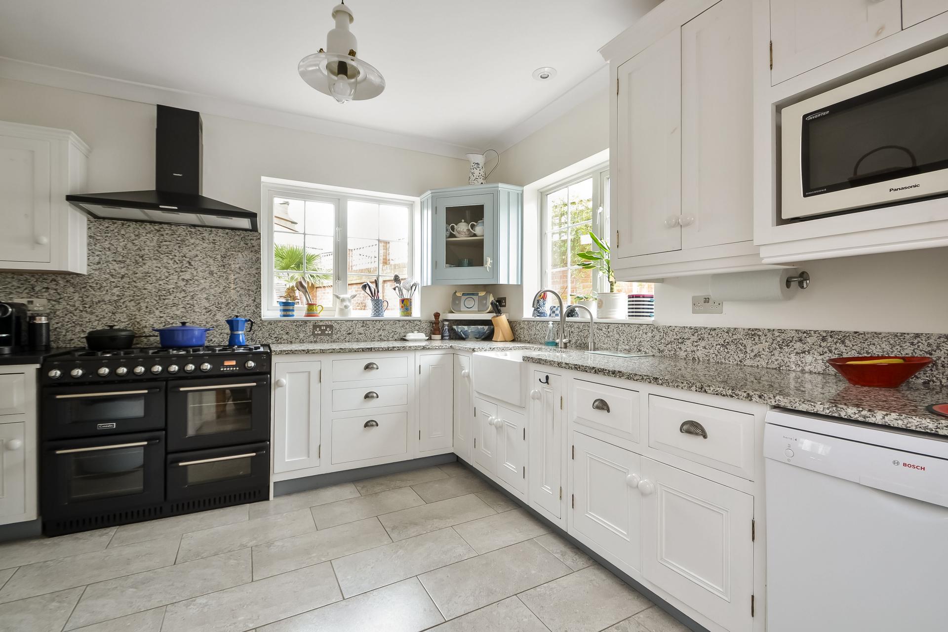 KITCHEN 15' 7" x 11' 1" (4.75m x 3.38m) Primary area, recess opening with double glazed door leading to covered outer lobby area, recessed coir mat, door to larder/understairs storage cupboard. Range of bespoke country kitchen style units with granite work surface, range of drawers and cupboards under, dishwasher point, shelving for microwave, double glazed window to rear aspect, butler sink with mixer tap and Quooker hot water tap, water softener, tiled splashback, corner unit with glazed panelling and shelving, double glazed window to side aspect overlooking garden, chrome fronted power points, free standing range style cooker with gas point, extractor hood, fan and light over, tall larder style unit with range of shelving, space for free standing fridge and freezer, ceiling spotlights and coving, square opening leading to breakfast room.