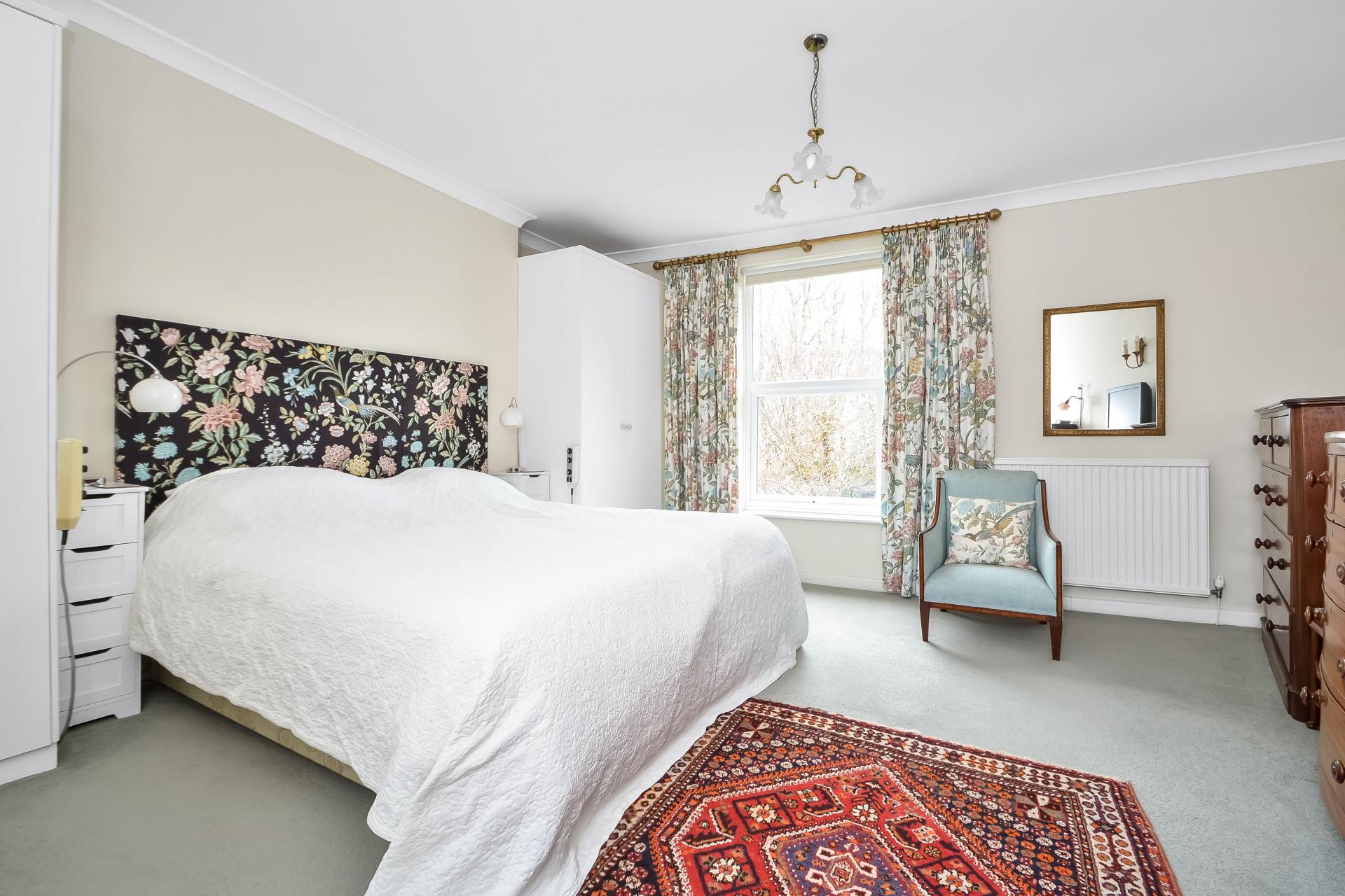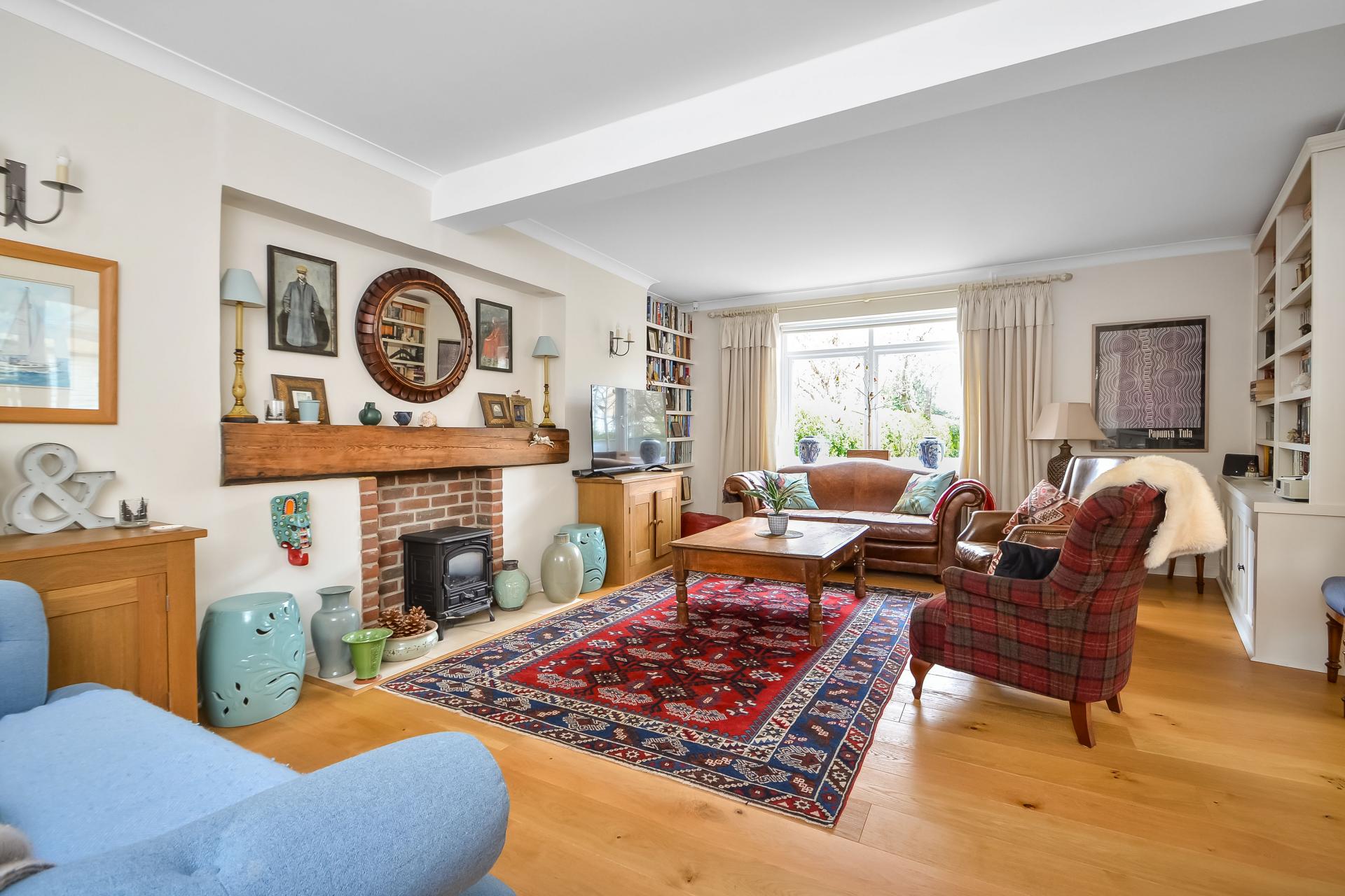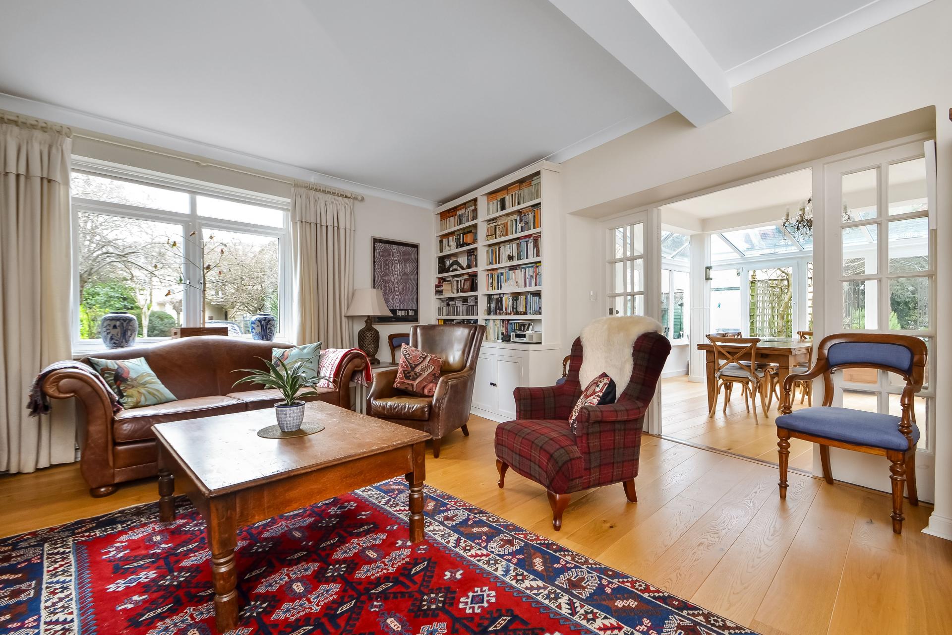 SITTING ROOM 22' 11" x 16' 3" (6.99m x 4.95m) Angled to one wall, double glazed windows to front aspect overlooking driveway, range of built-in book shelving with storage cupboards under, wooden flooring, double radiator, fire surround with exposed brick inlay, tiled hearth and wooden mantle over, recessed book shelving to one side, ceiling coving, double glazed window to rear aspect, further range of shelving, door to inner lobby.