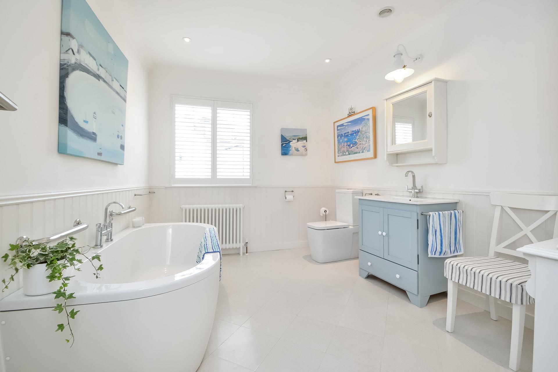 FEATURE FAMILY BATHROOM 11' 6" x 9' 3" (3.51m x 2.82m) Double glazed window to rear aspect with plantation shutter blinds, roll top radiator, double ended panelled bath with central mixer tap, panelling to dado rail level, white per-finished cork tile flooring, wash hand basin with mixer tap and cupboards under, close coupled w.c., extractor fan, ceiling coving and spotlights, wall light.