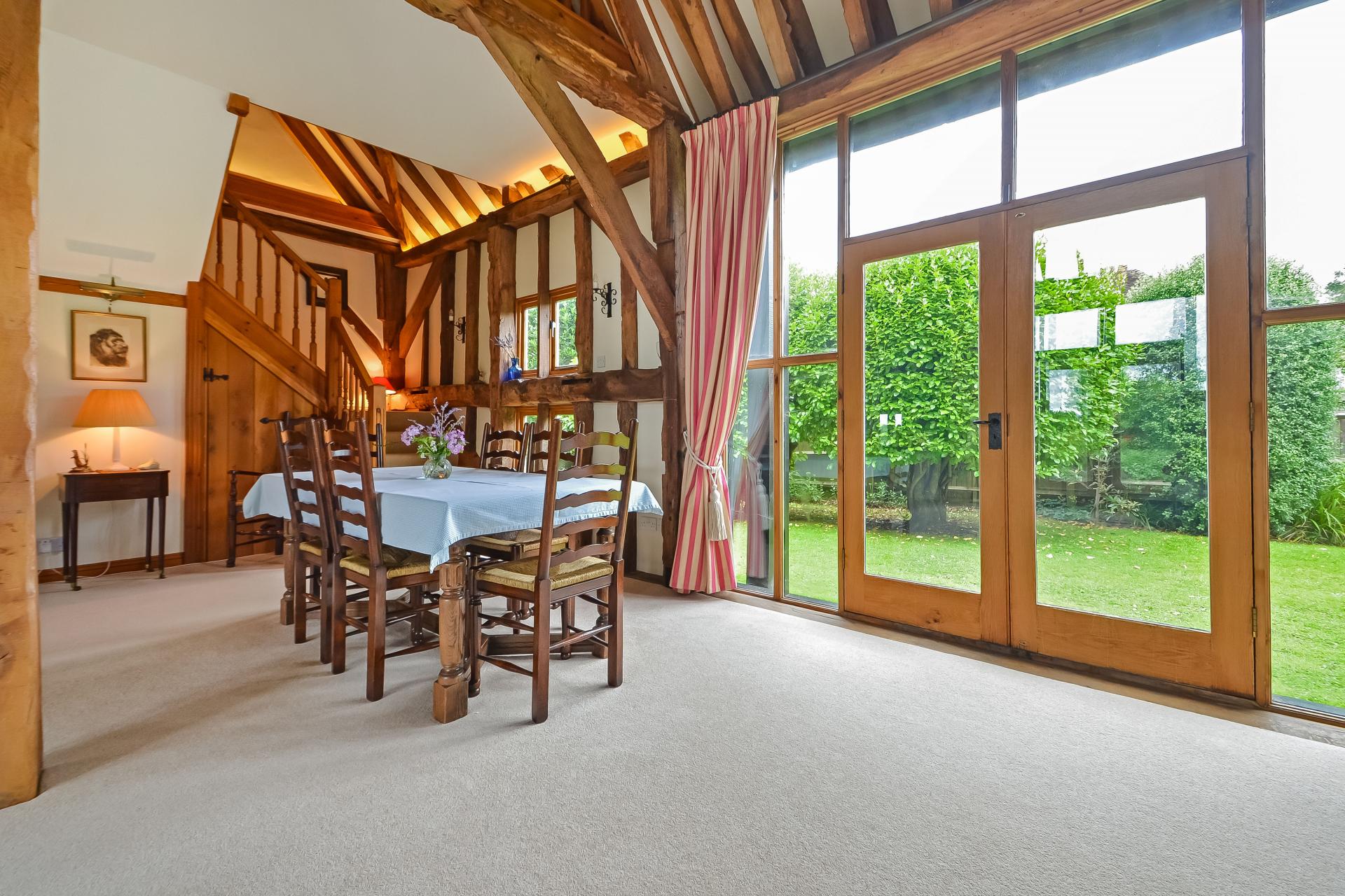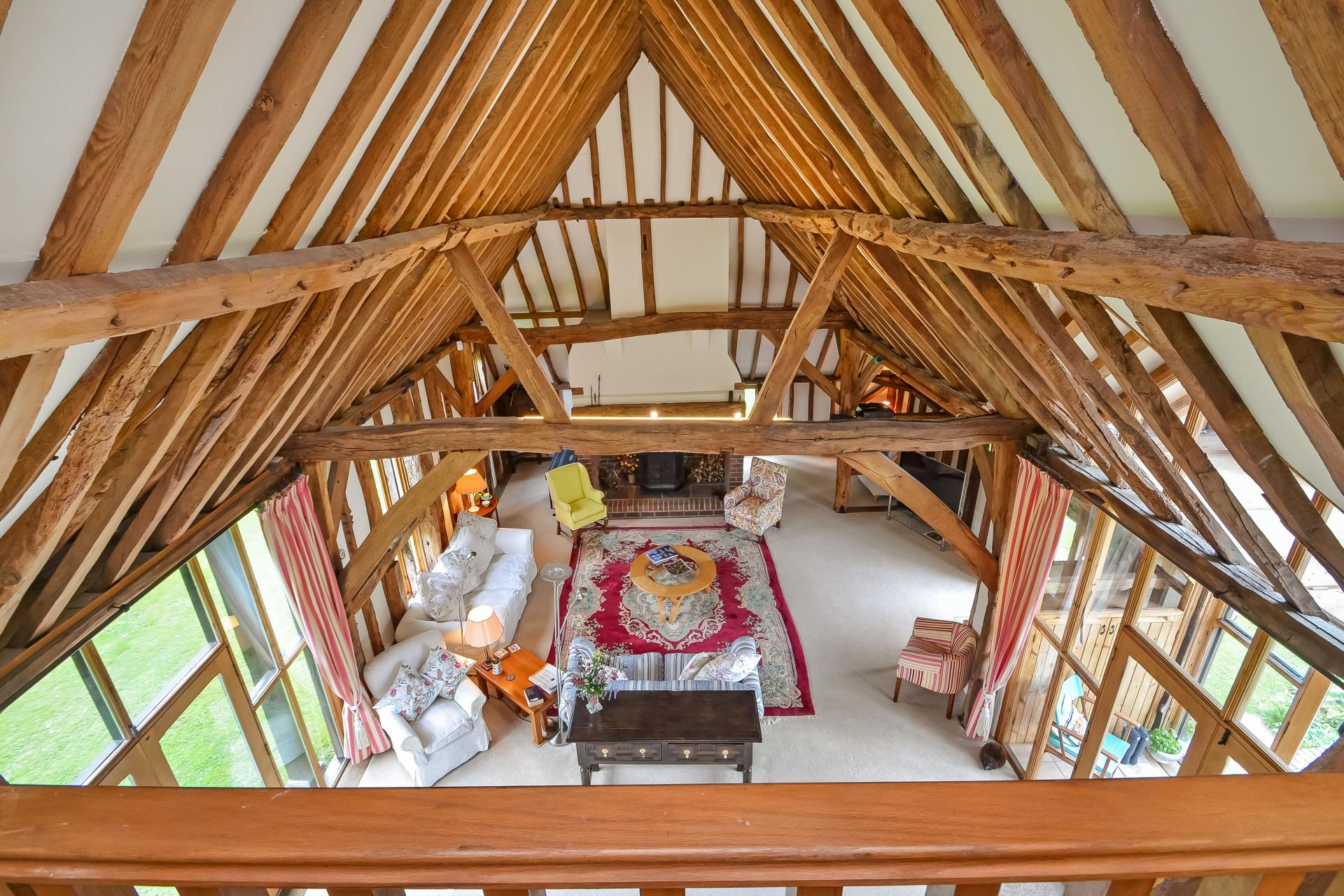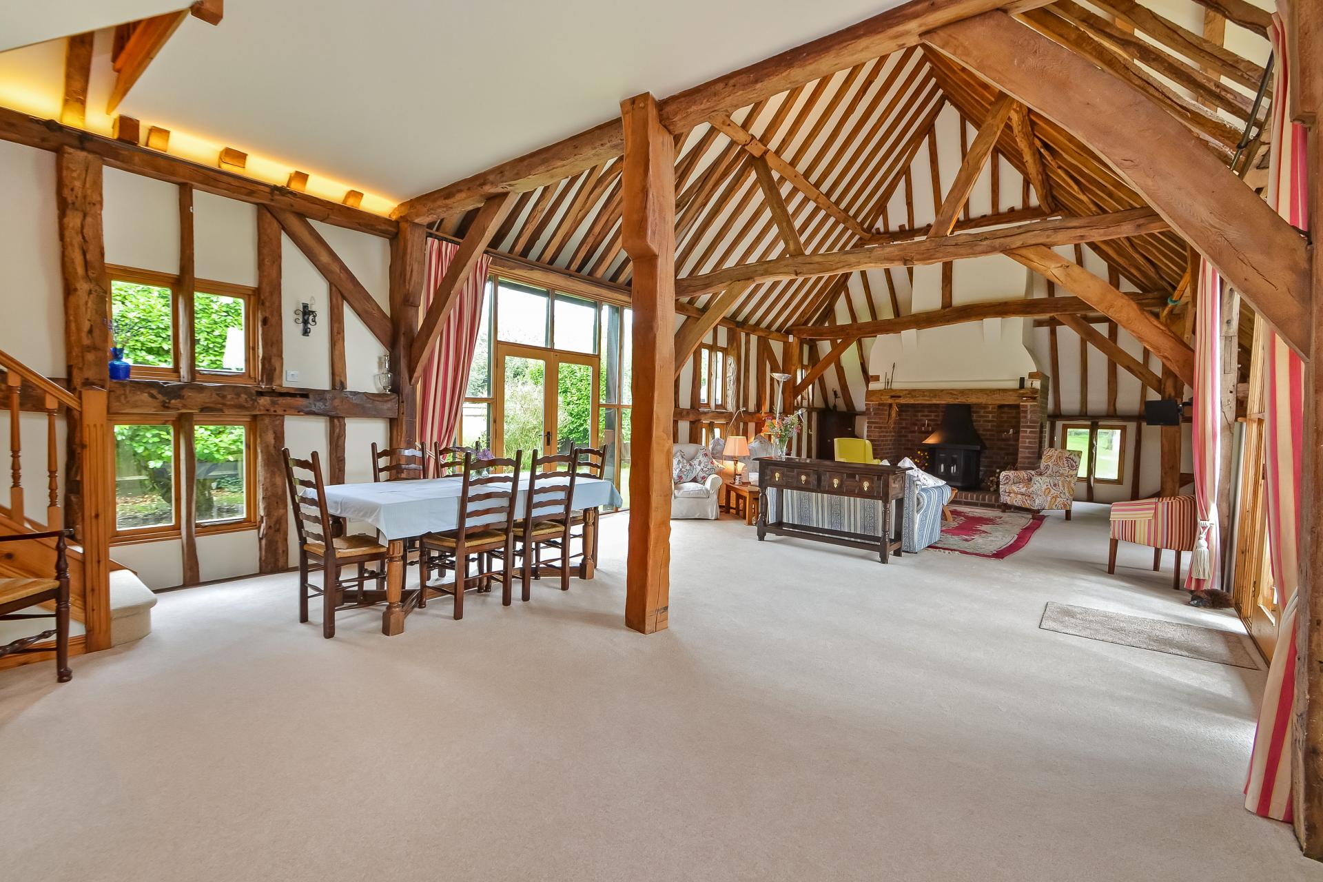 Nobles Barn was re-built approximately 30 years ago in the style of the former barn with the primary vaulted ceiling sitting room accommodating the northern wing and the three-storey living accommodation to the southern wing. It has an abundance of character with wood cladding and a high-pitched slate roof and is of extensive architectural interest.The property has 4516 sq ft of living space including a detached garage/studio and large workshop. Set in a hamlet where development is rare, this is truly a property not to be missed. The interior of the barn has been designed with modern life very much in the forefront, it is beautiful with many exposed beams, a vaulted ceiling galleried landing, wooden staircases and supporting beams. Although there are large open internal spaces the barn is warm and airy, as the honey colouring of the oak timbers provides a welcome and natural feel.