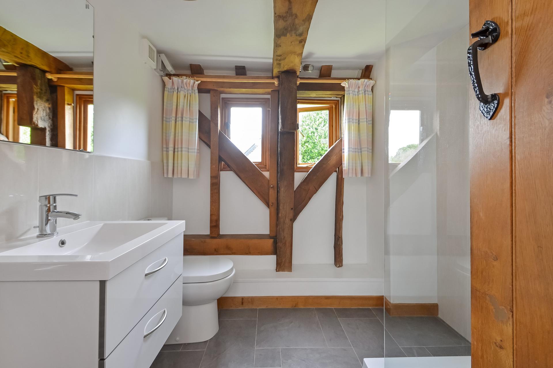 SHOWER ROOM Large shower cubicle with floor drain away, shower screen, exposed beams to ceiling, tiled flooring, chrome heated towel rail, rectangular wash hand basin with drawers under and mirror, light and shaver point over, closed coupled w.c, double glazed windows to rear aspect, ceiling spotlights, extractor fan.