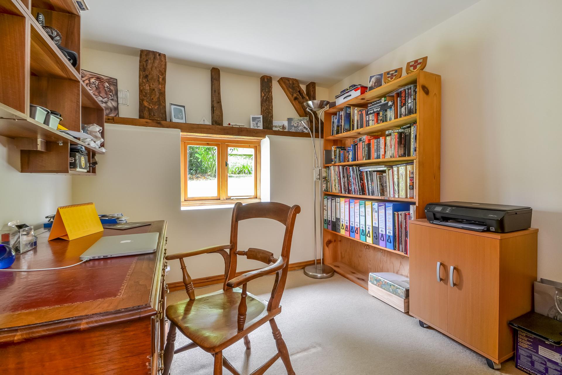 STUDY 9' 6" x 8' 8" (2.9m x 2.64m) Double glazed wood surround window to rear aspect overlooking garden, range of exposed beams and shelving, panelled door, stripped and stained skirting boards.