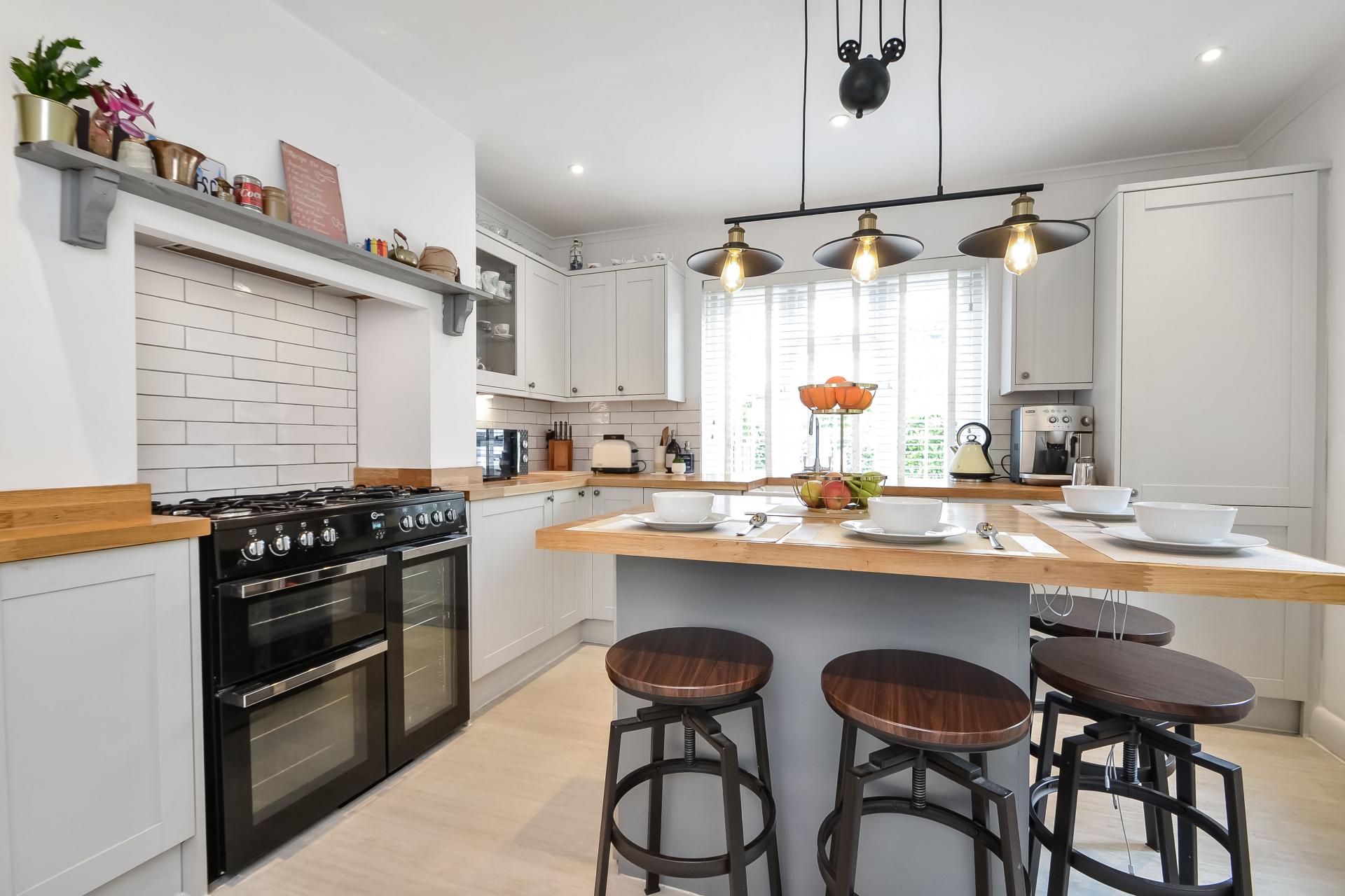 KITCHEN / BREAKFAST ROOM 12' 0" x 11' 1" (3.66m x 3.38m) Double glazed window to side aspect overlooking garden, comprehensive range of light grey fronted wall and floor units with wood block work surface, inset Butler sink with mixer tap, range of drawer units, corner storage cupboard, ceramic tiled surrounds, under unit lighting, two wall mounted units with glazed doors and shelving, double glazed window to front aspect overlooking driveway and garden, integrated dishwasher with matching door, tall cupboard with space for fridge/freezer, free standing range style cooker with five ring gas hob, ovens under and extractor hood, fan and light over, tall central island with wood block surface, breakfast bar, wine shelf, cooler and range of cupboards under, contemporary style radiator, ceiling spotlights, vinyl flooring.