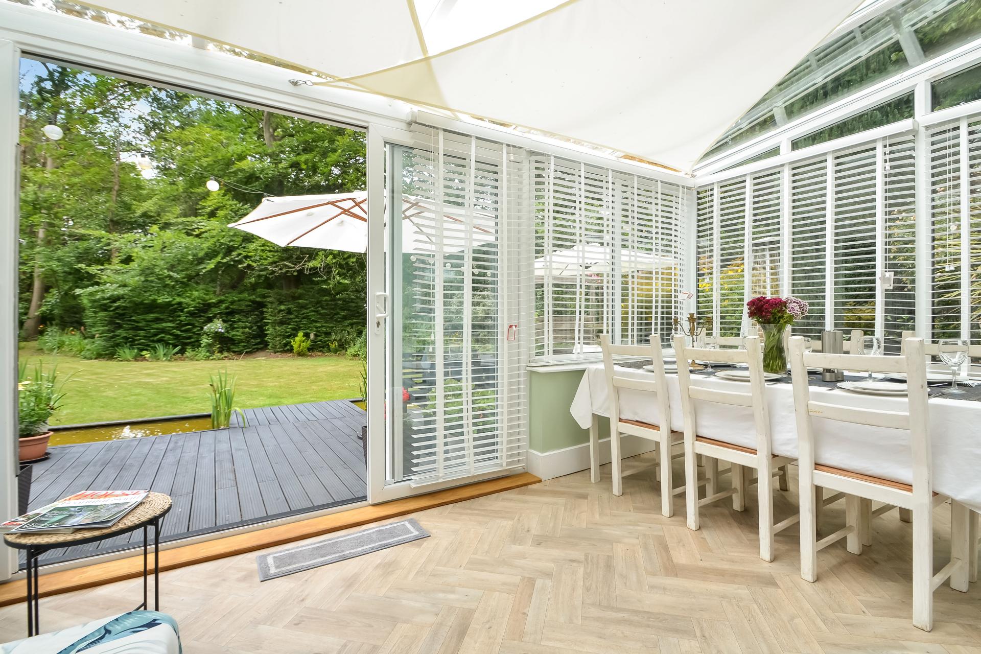 CONSERVATORY / DINING ROOM 16' 5" x 9' 2" (5m x 2.79m) Vinyl wood effect flooring, double glazed windows to all aspects with central sliding doors leading to garden, glass roof with sail blinds.