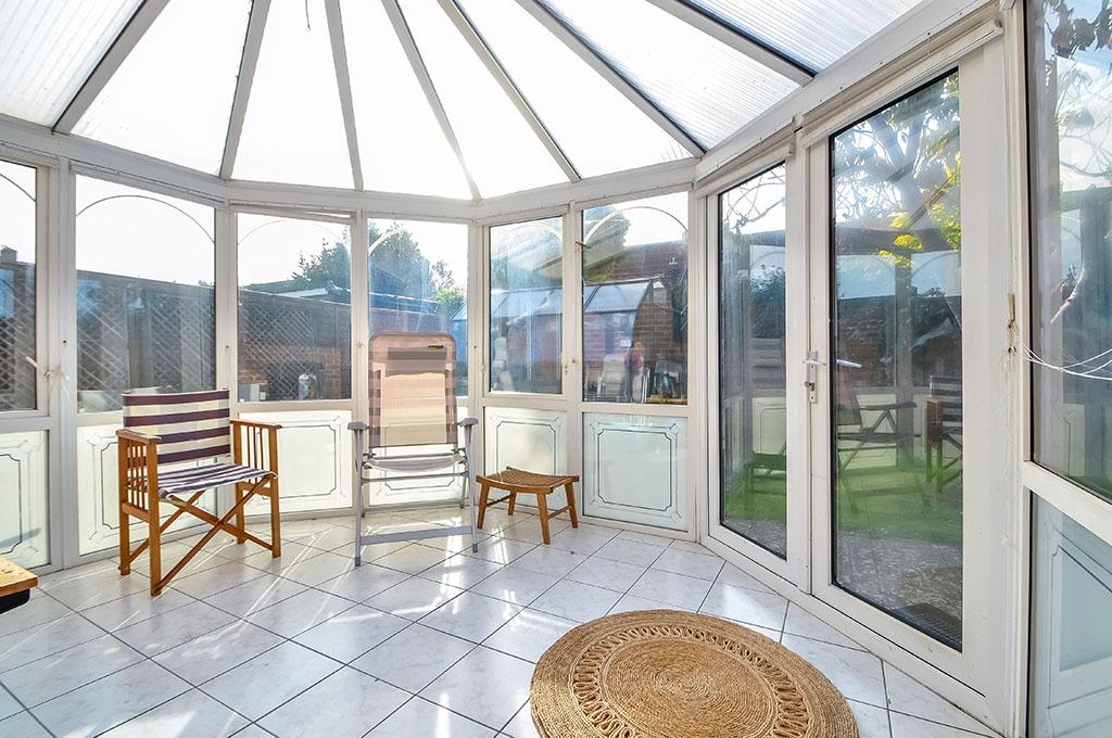 Conservatory: white UPVC double-glazed, ceramic tiled flooring and brick exposed wall.