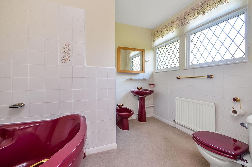 En Suite: Mulberry coloured suite with corner bath and shower over, pedestal wash basin, bidet, WC, wall-mounted mirrored cabinet. Internal high-level window over staircase.