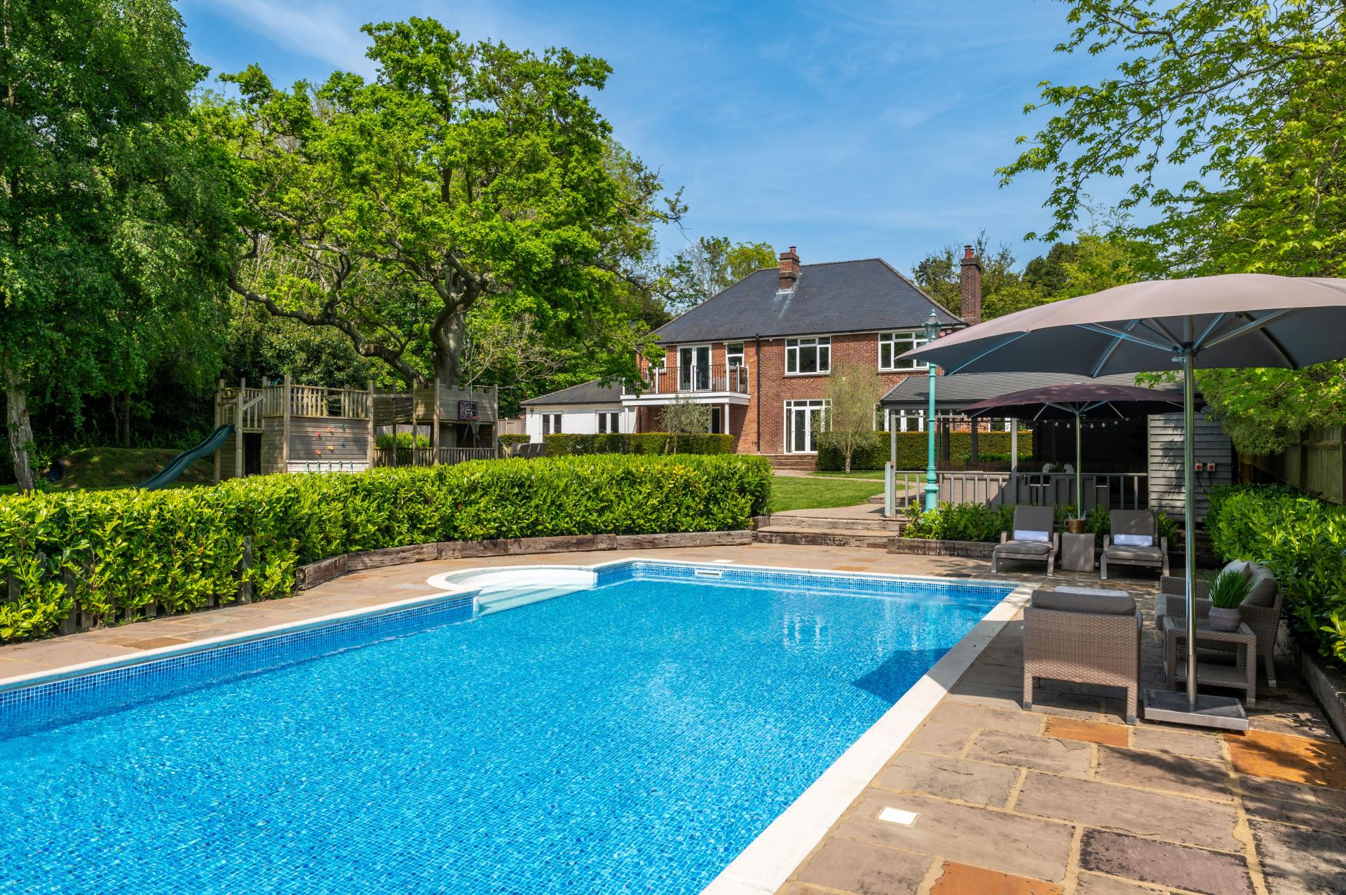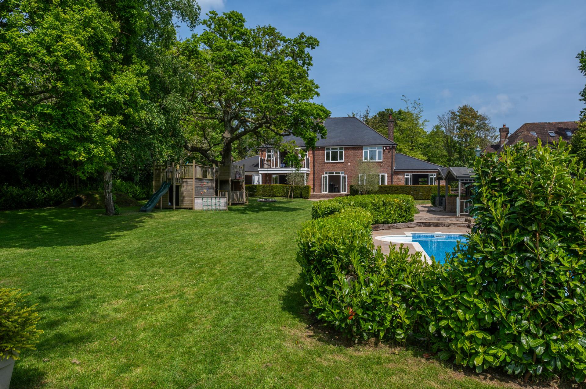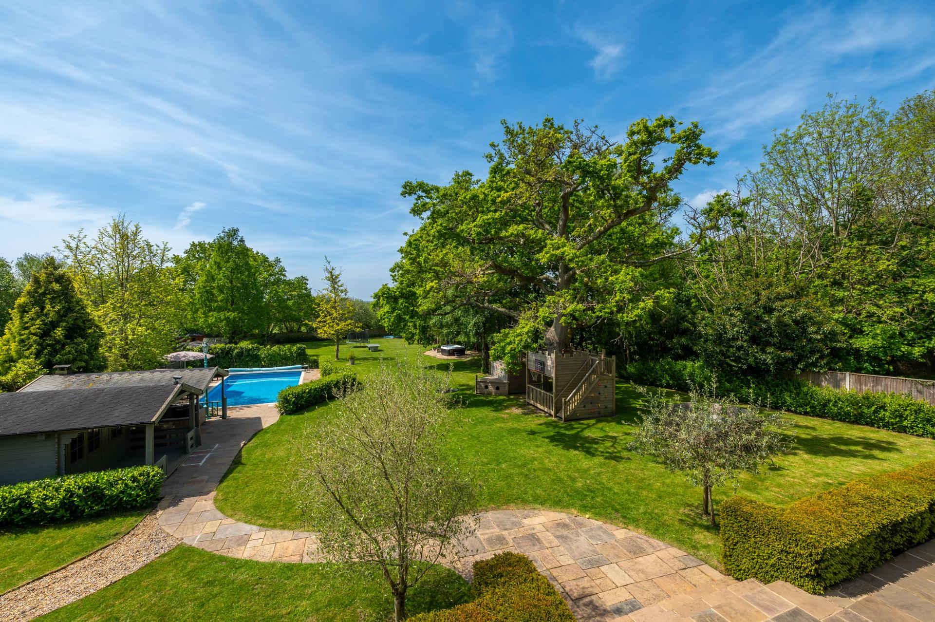 OUTSIDE To the rear accessible from the primary rooms is a flagstone raised terrace and manicured hedge with steps leading down to matching flagstone curved pathway which wraps around to the front of the summer house, al-fresco dining area and lawned garden and swimming pool, pillared raised balcony to primary bedroom, the garden is laid to lawn with hidden French drains, mature trees, shrubs, evergreens and bushes. To the left hand side of the property is a brick paviour driveway measuring approximately 11'0" in width with outside power points, stable style gates leading to shingled pathway leading to lawned garden. The garden has built-in play areas including ship and slide, decked walk way, swings, approximately half way down the garden is a hard core area with hot tub, to the right hand side of the property is a pedestrian gate leading to rear garden.