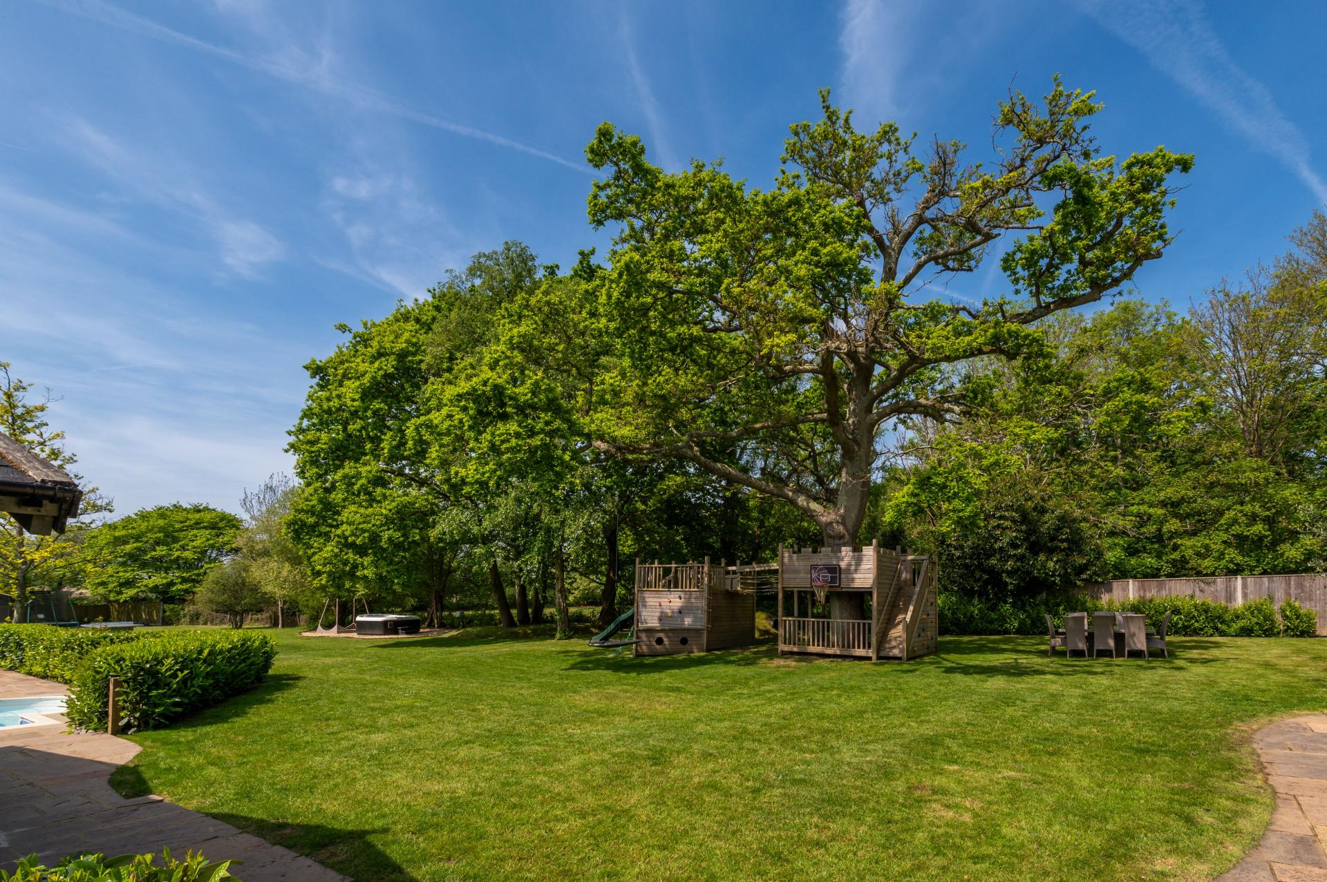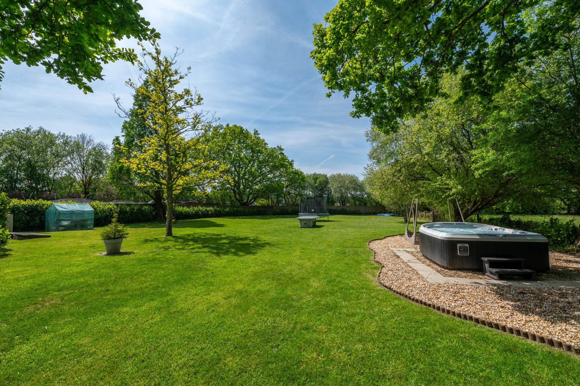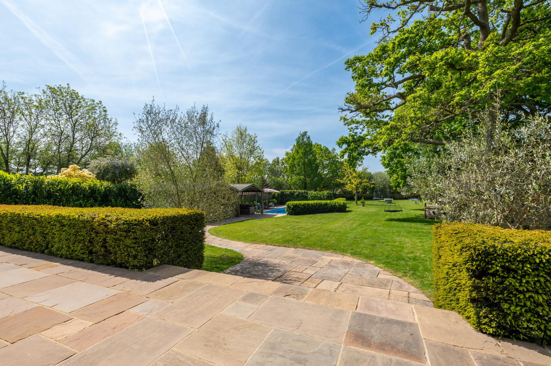 OUTSIDE To the rear accessible from the primary rooms is a flagstone raised terrace and manicured hedge with steps leading down to matching flagstone curved pathway which wraps around to the front of the summer house, al-fresco dining area and lawned garden and swimming pool, pillared raised balcony to primary bedroom, the garden is laid to lawn with hidden French drains, mature trees, shrubs, evergreens and bushes. To the left hand side of the property is a brick paviour driveway measuring approximately 11'0" in width with outside power points, stable style gates leading to shingled pathway leading to lawned garden. The garden has built-in play areas including ship and slide, decked walk way, swings, approximately half way down the garden is a hard core area with hot tub, to the right hand side of the property is a pedestrian gate leading to rear garden.