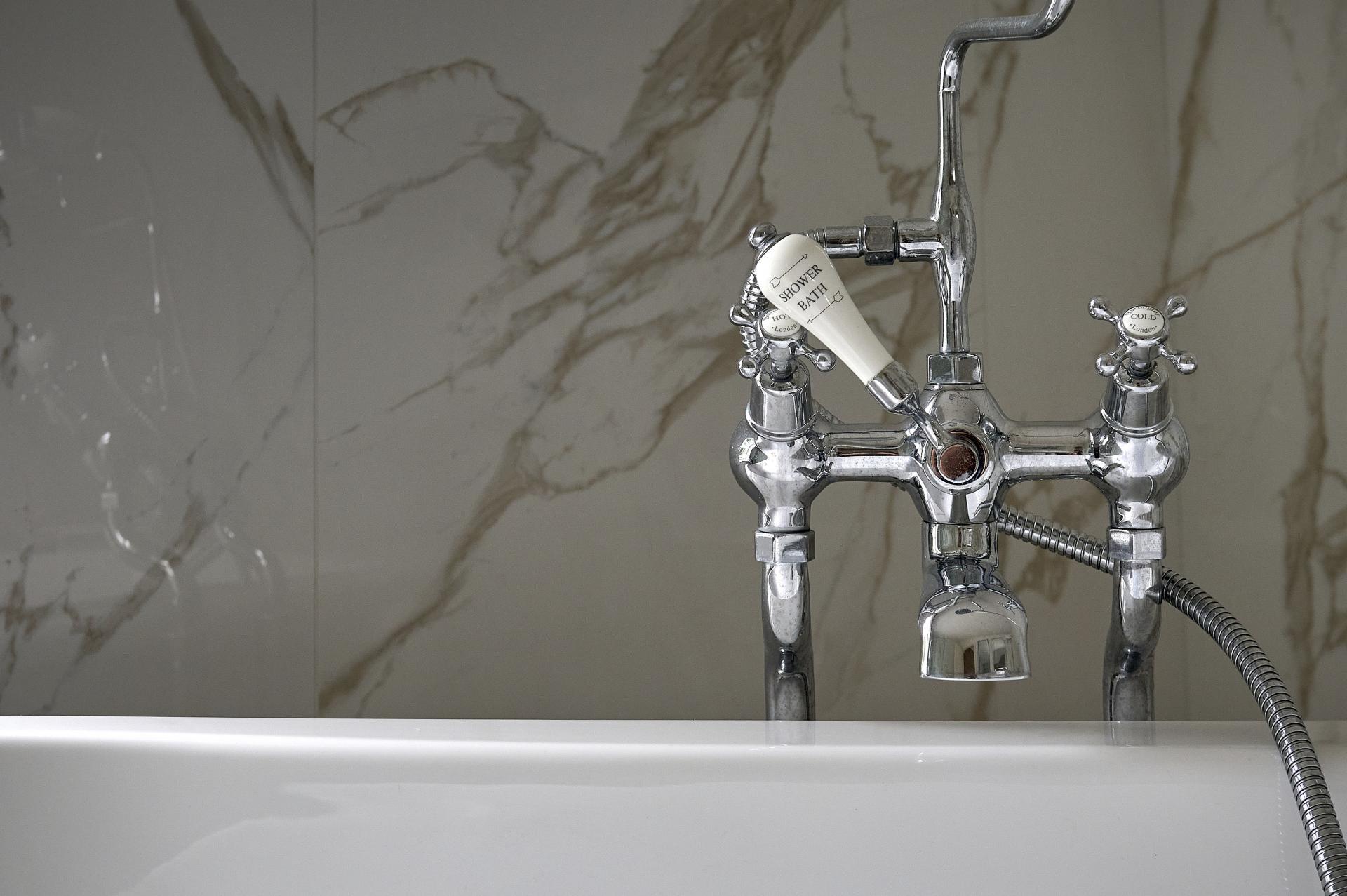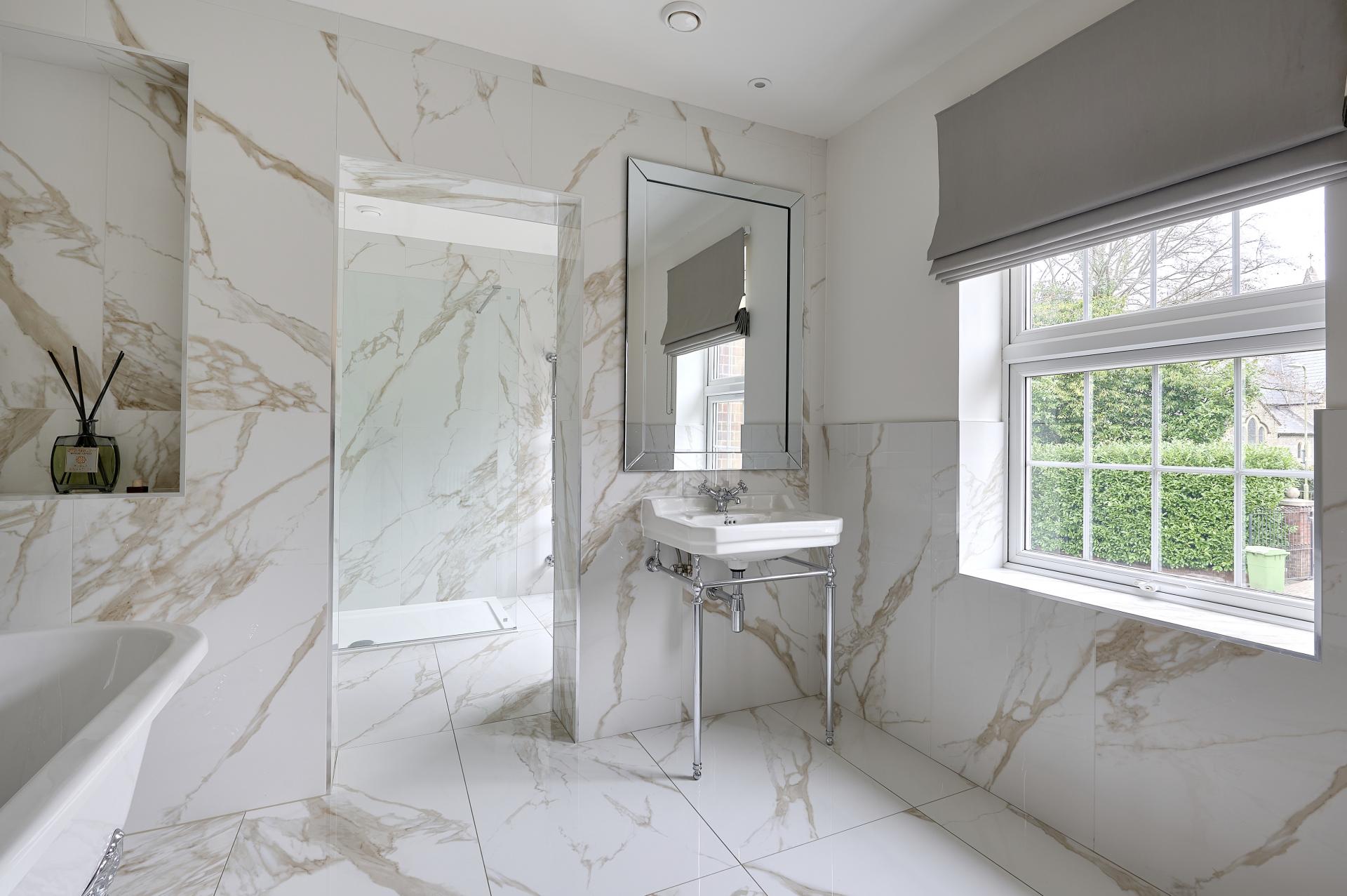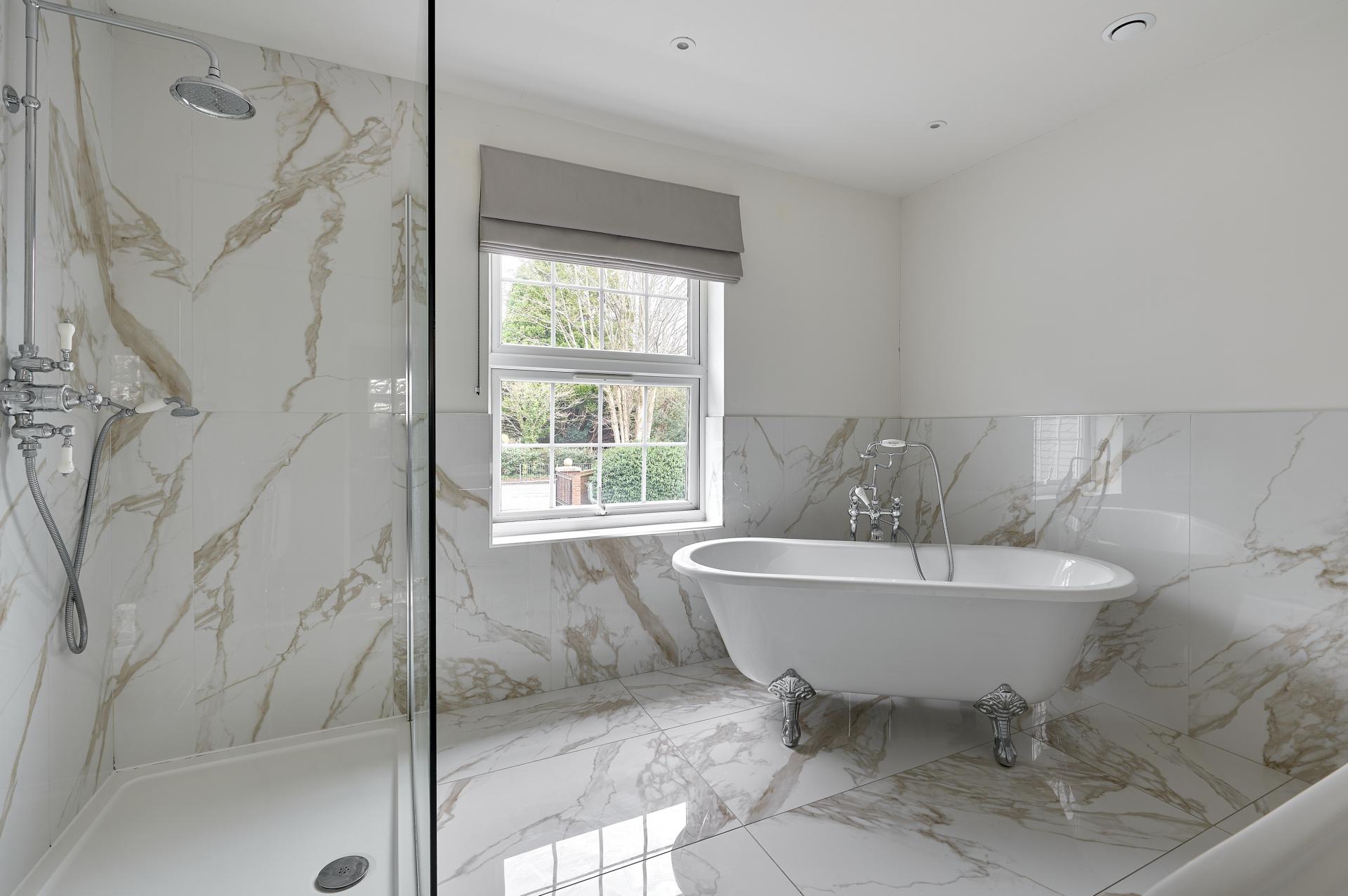BATHROOM 9' 7" x 9' 0" (2.92m x 2.74m) Double glazed sash window to front aspect overlooking driveway and views towards the St John the Baptist Church, large marble tiled flooring and matching tiles to two walls, double ended free standing claw footed bath with telephone style mixer tap and shower attachment, recessed shelf to one end, radiator with chrome towel rail over, wash hand basin with mixer tap and chrome legs, ceiling spotlights, extractor fan, square opening leading to: