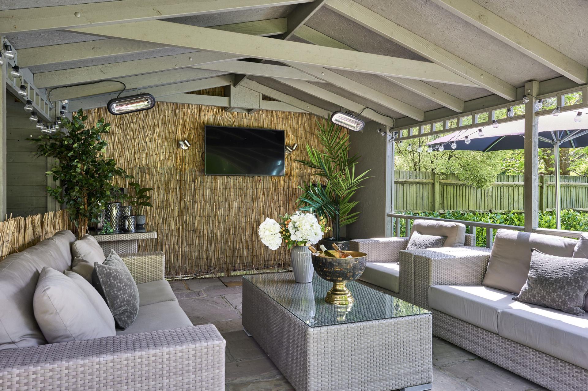 SUMMER HOUSE Detached chalet with twin doors to front and windows to either side with covered veranda, adjacent to this is an open pitched roof T.V., room/al-fresco dining area with wall heaters, flagstone flooring and balustrade, from here there are steps leading down to: