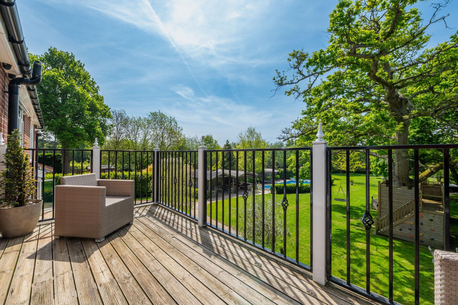 BALCONY Accessible from the primary bedroom is a decked balcony with wrought iron railings and far reaching views over woodland and farmland.