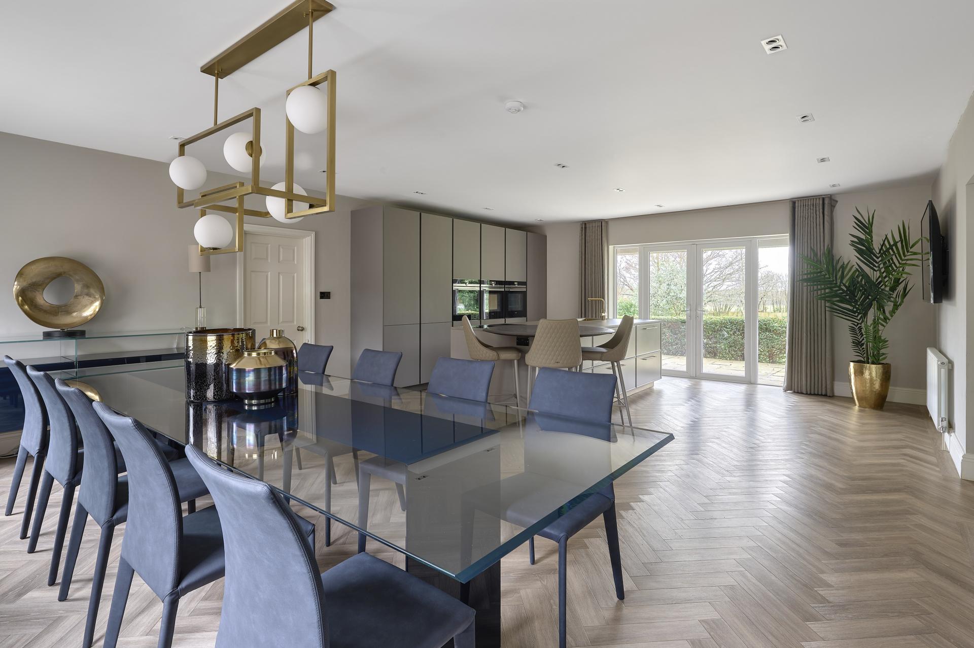 Kitchen: Comprehensive range of full height soft close cabinets with range of shelving, eye-level Siemens oven with cabinets over and under, Siemens grill and second microwave oven, tall integrated fridge and freezer with matching doors, matching LVT flooring, central island with composite worktop, inset sink unit with mixer tap and drawers under, integrated Miele dishwasher, bin drawer, range of pan drawers, inset Elica induction hob with central extractor, ceiling spotlights, roll top radiator, wiring for wall mounted T.V., twin double glazed French doors with full height windows to either side with views over the garden towards woodland and farmland beyond.