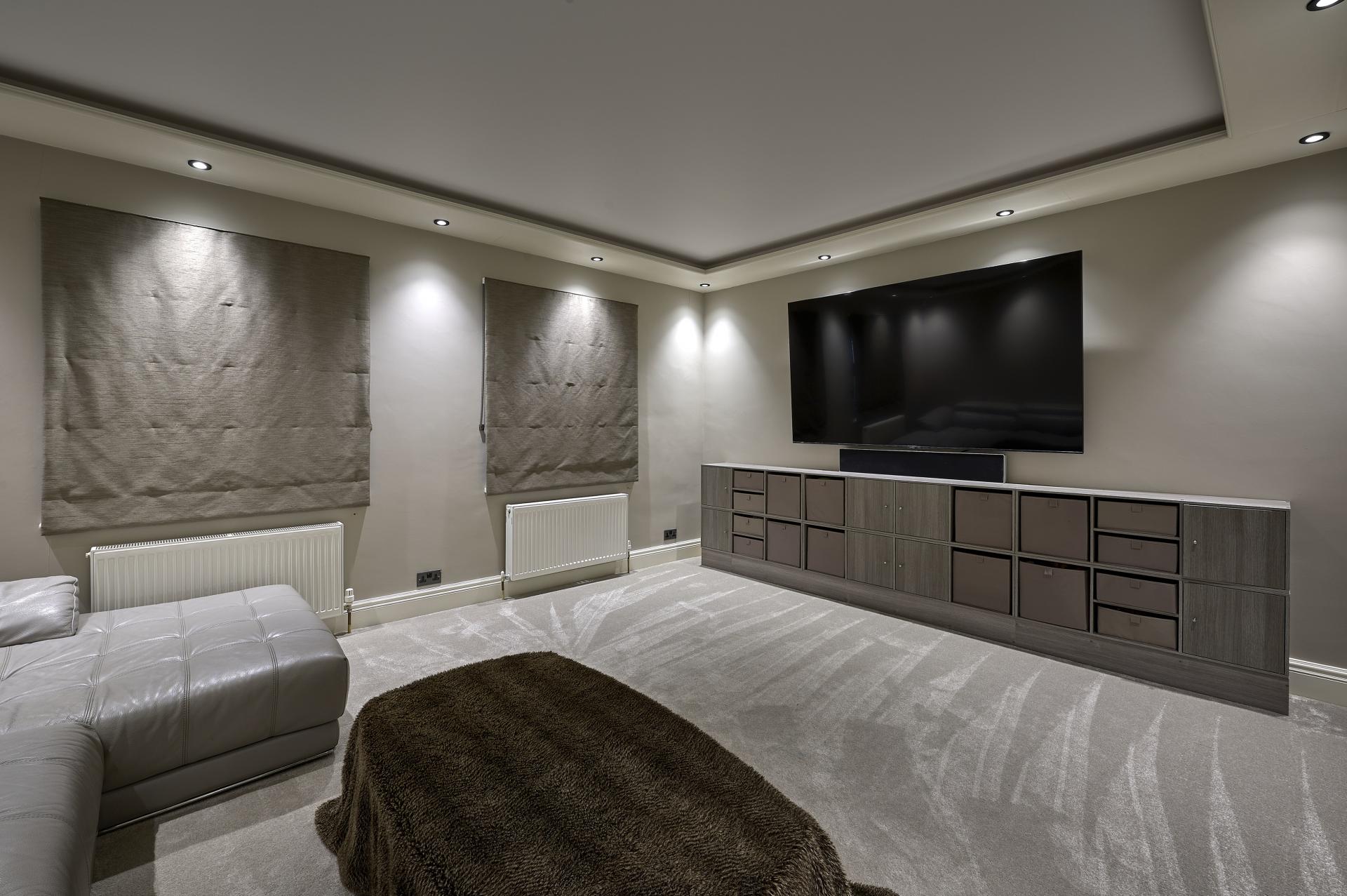 CINEMA ROOM 16' 7" x 13' 2" (5.05m x 4.01m) Double glazed windows to side aspect with radiators under, wiring and bracket for wall mounted T.V., concealed pelmet lighting over with spotlights and hidden lighting.