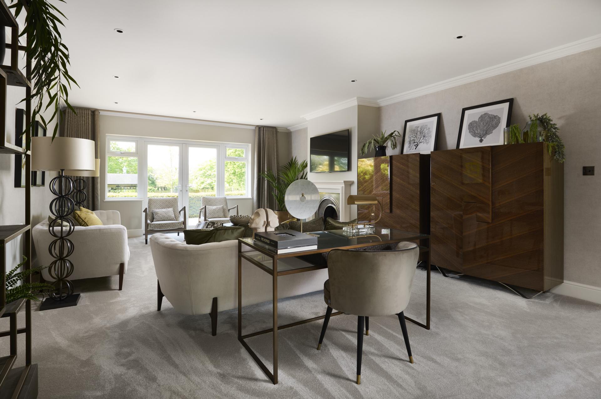 FAMILY ROOM 19' 9" x 12' 9" (6.02m x 3.89m) Matching Amtico flooring, ornate ceiling coving, tall roll top radiator, twin double glazed French doors leading to terrace with views over garden, farmland and woodland beyond, second radiator, wiring for wall mounted T.V.