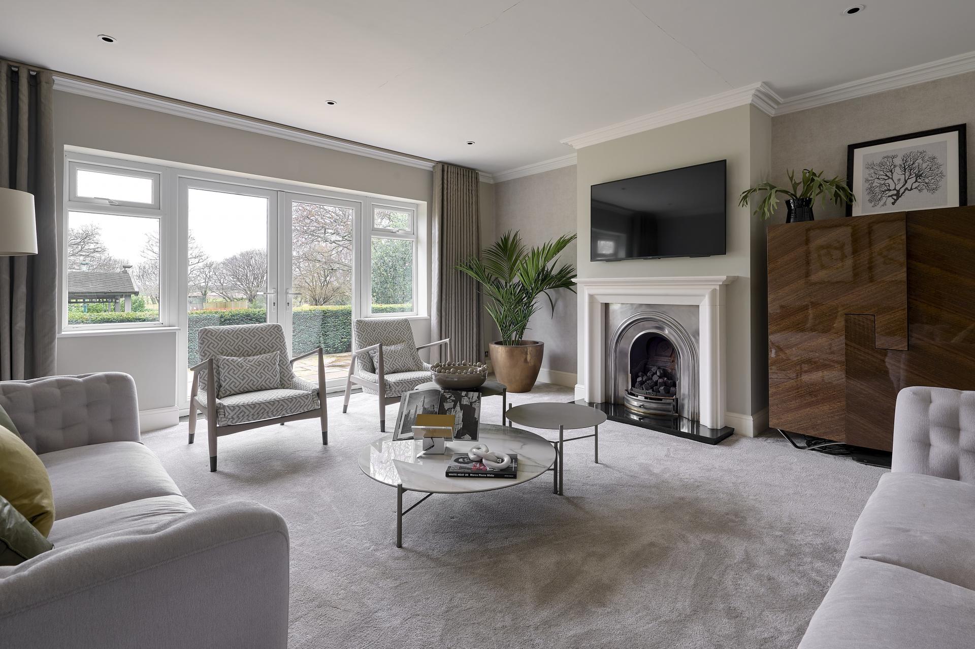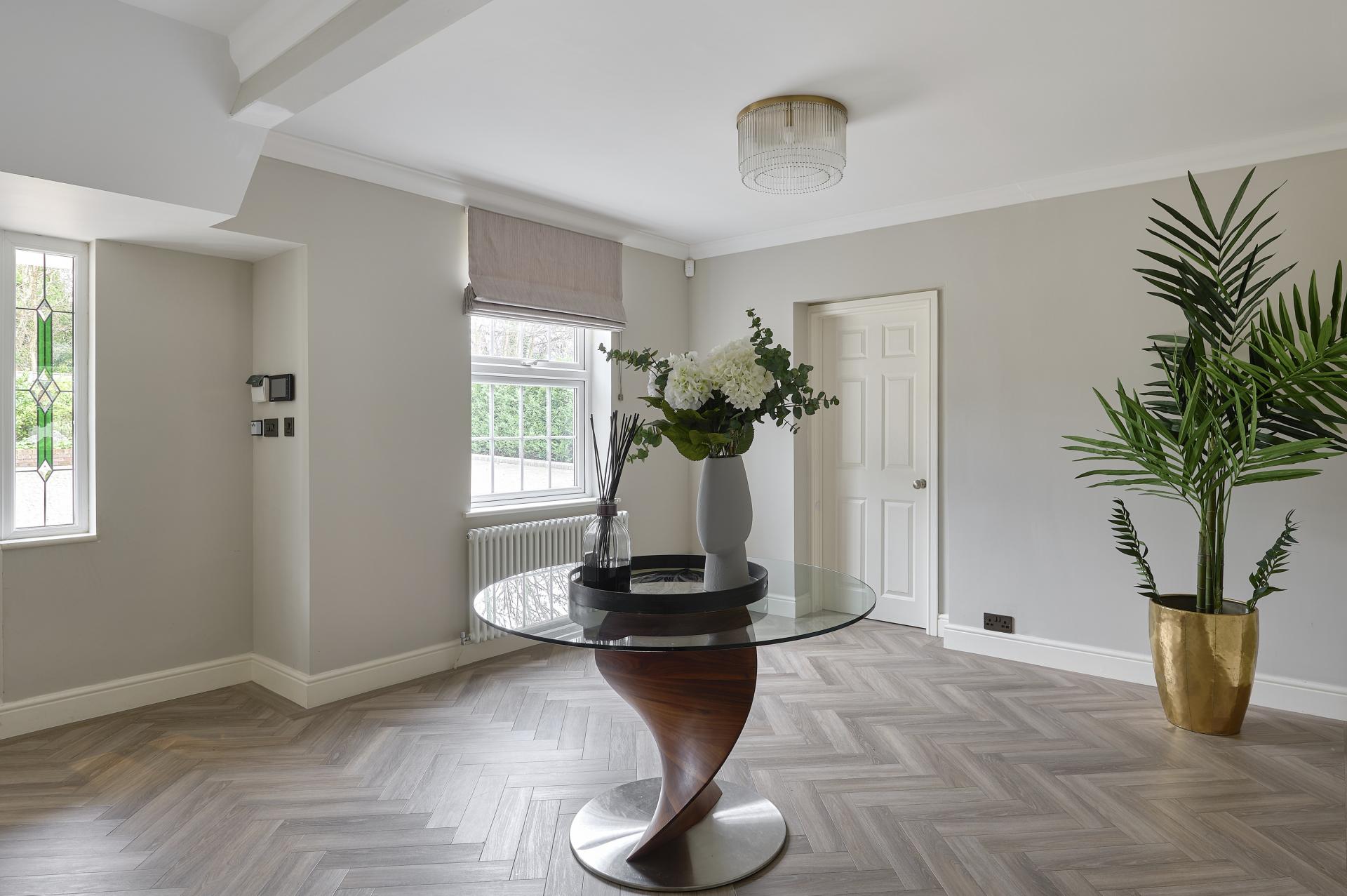 ENTERTAINMENT ROOM 13' 0" x 11' 0" (3.96m x 3.35m) Overall width of adjoining rooms 26'4". Twin double glazed French doors with full height windows to either side leading to raised terrace with views over garden towards farmland and woodland beyond, matching ceiling coving, ceiling spotlights, matching LVT flooring, roll top radiator, wall lights.