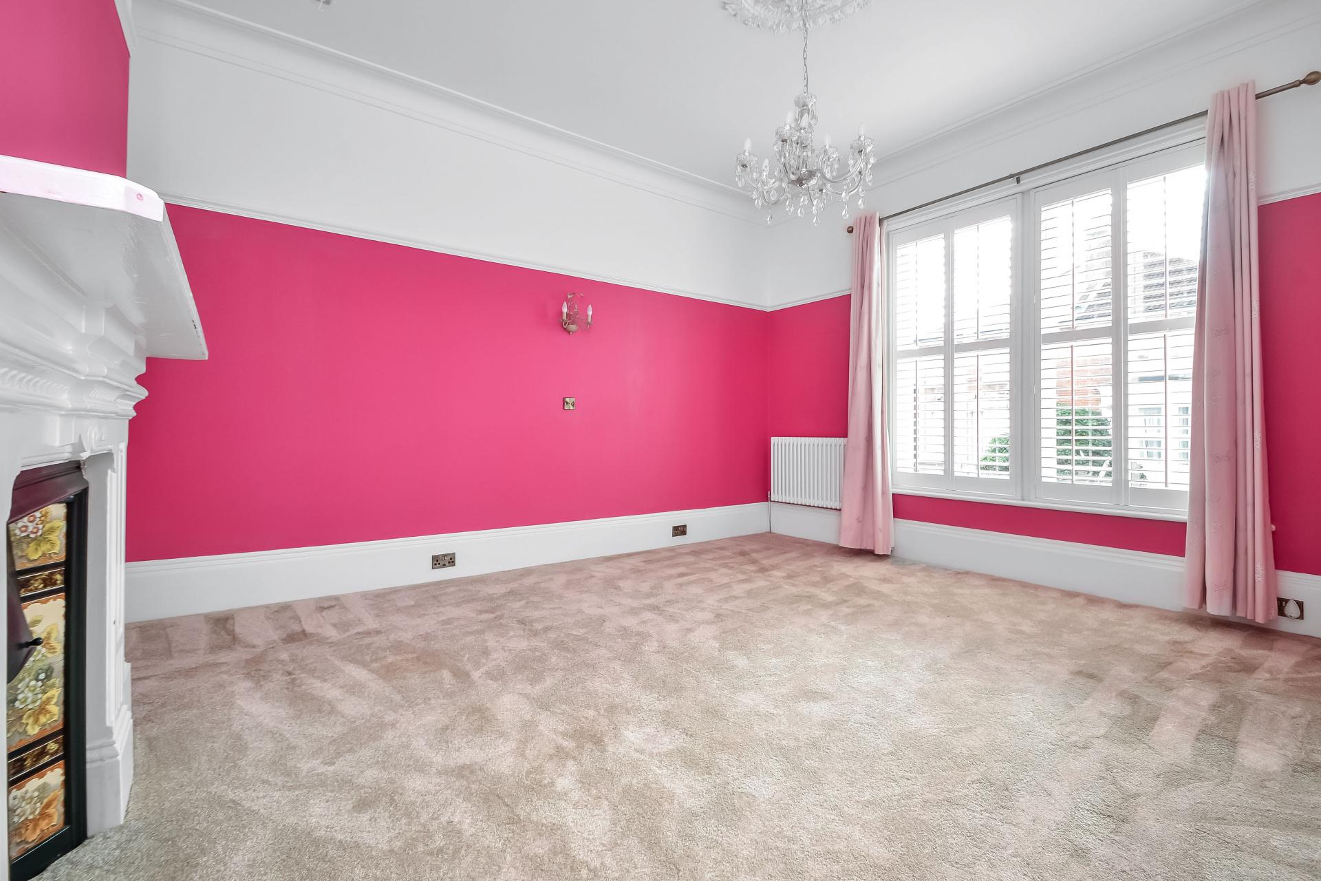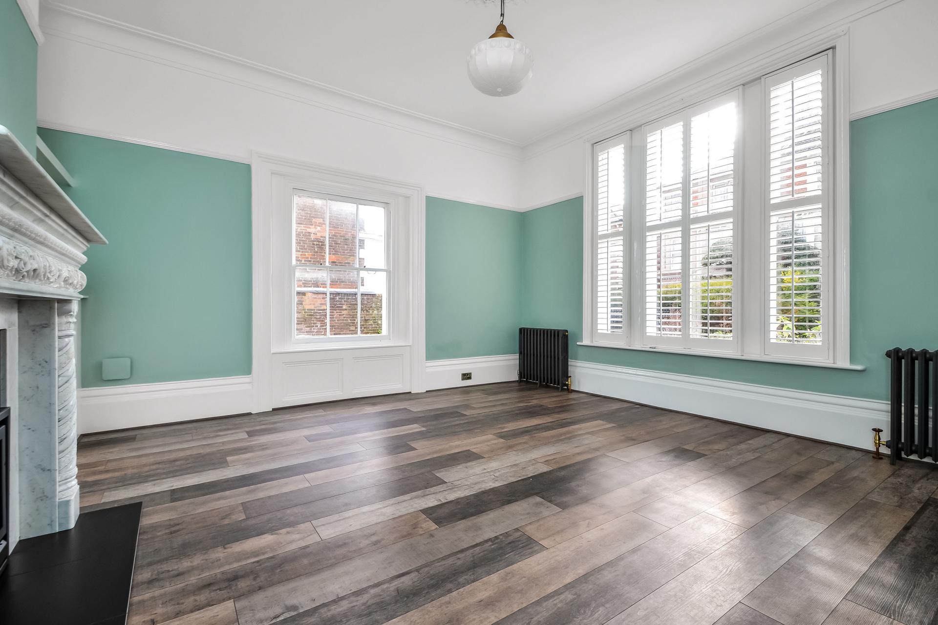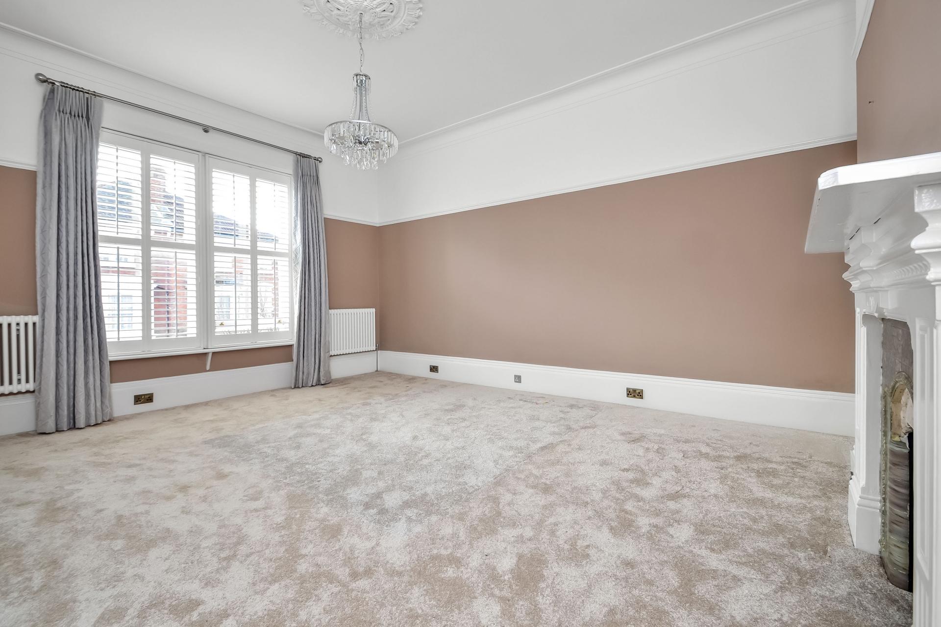 SITTING ROOM 16' 2" x 16' 0" (4.93m x 4.88m) Central chimney breast with feature Roger Pearson marble fireplace with pillars, log burner and tiled hearth (not tested), to either side of the chimney breast are built-in storage cupboards shelving over, high skirting boards, feature architraves, ceiling coving and rose, picture rail, sash window to side aspect with wood panelling under, two roll top radiators, sash window to front aspect with plantation shutter blinds, ceiling coving and rose, high ceiling measuring approximately 10'9" in height.