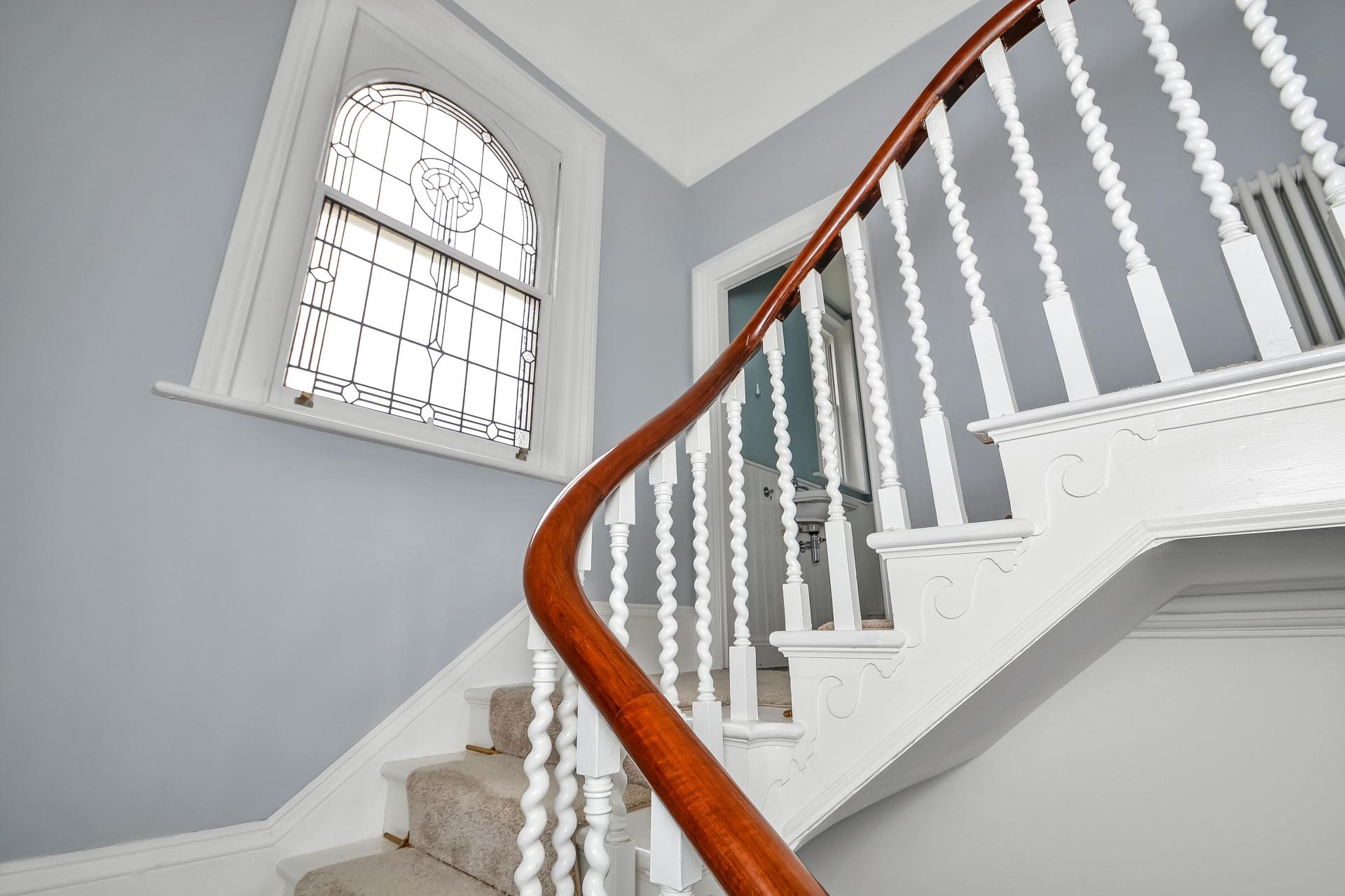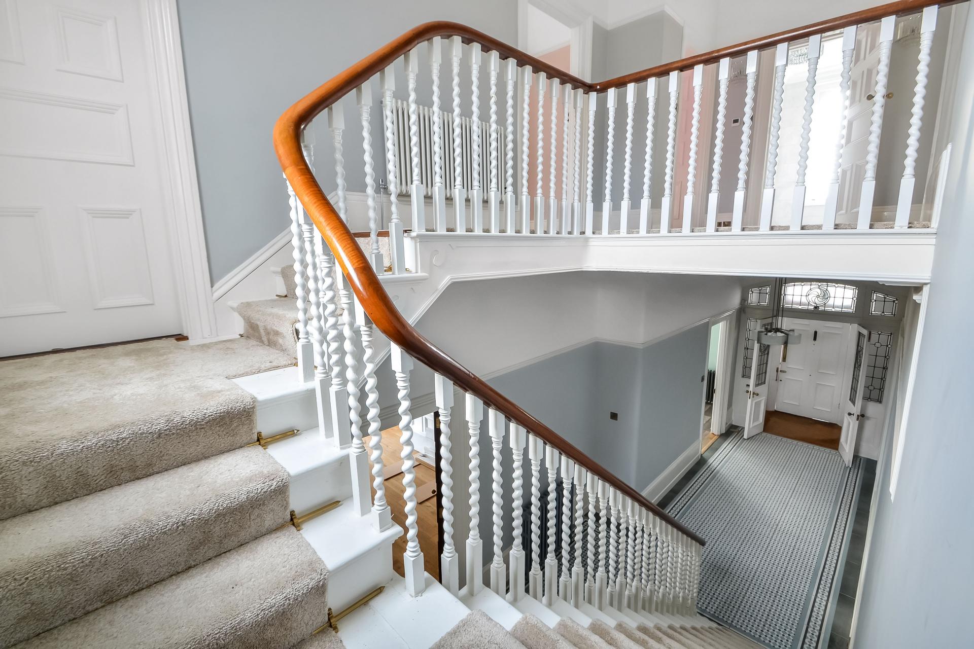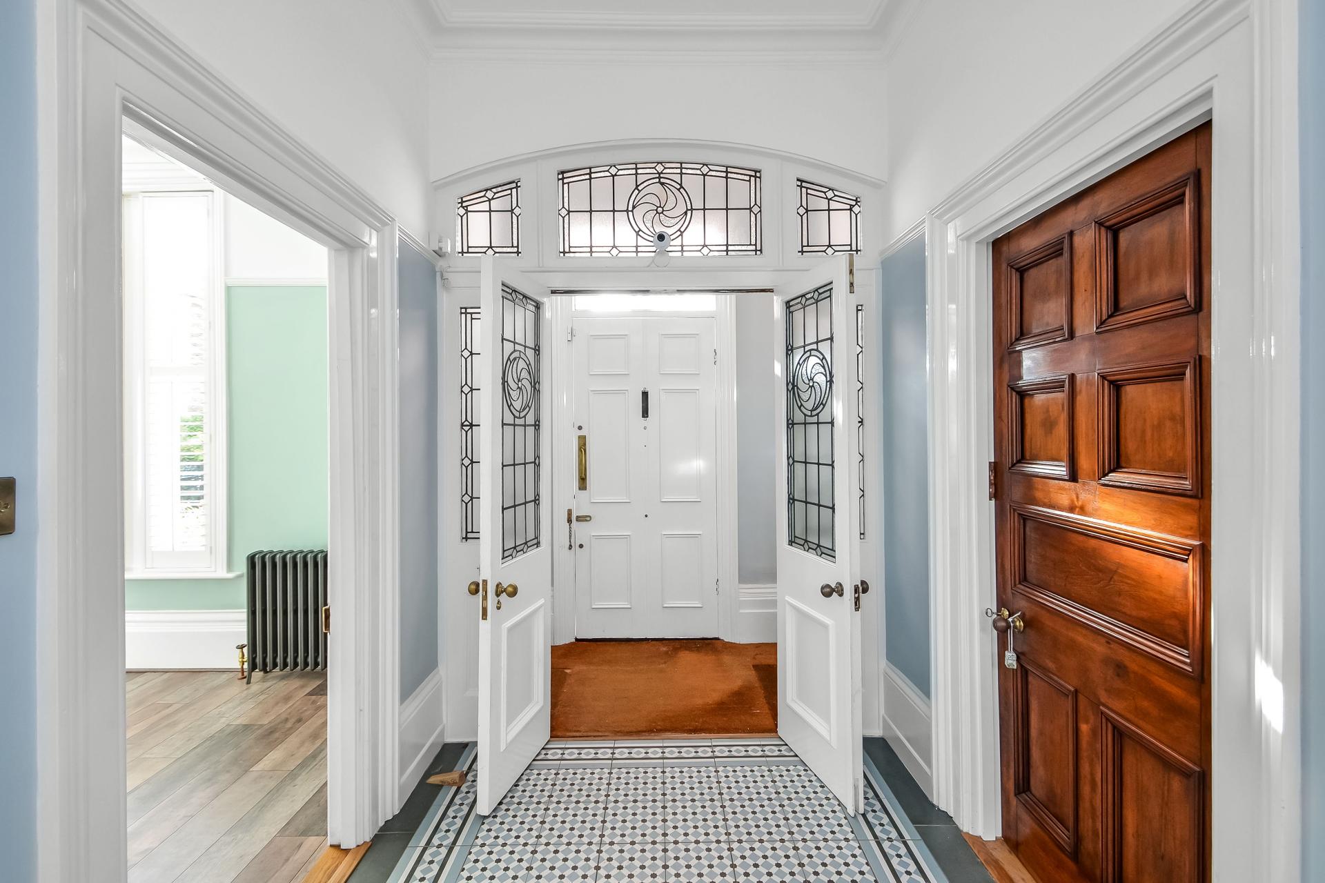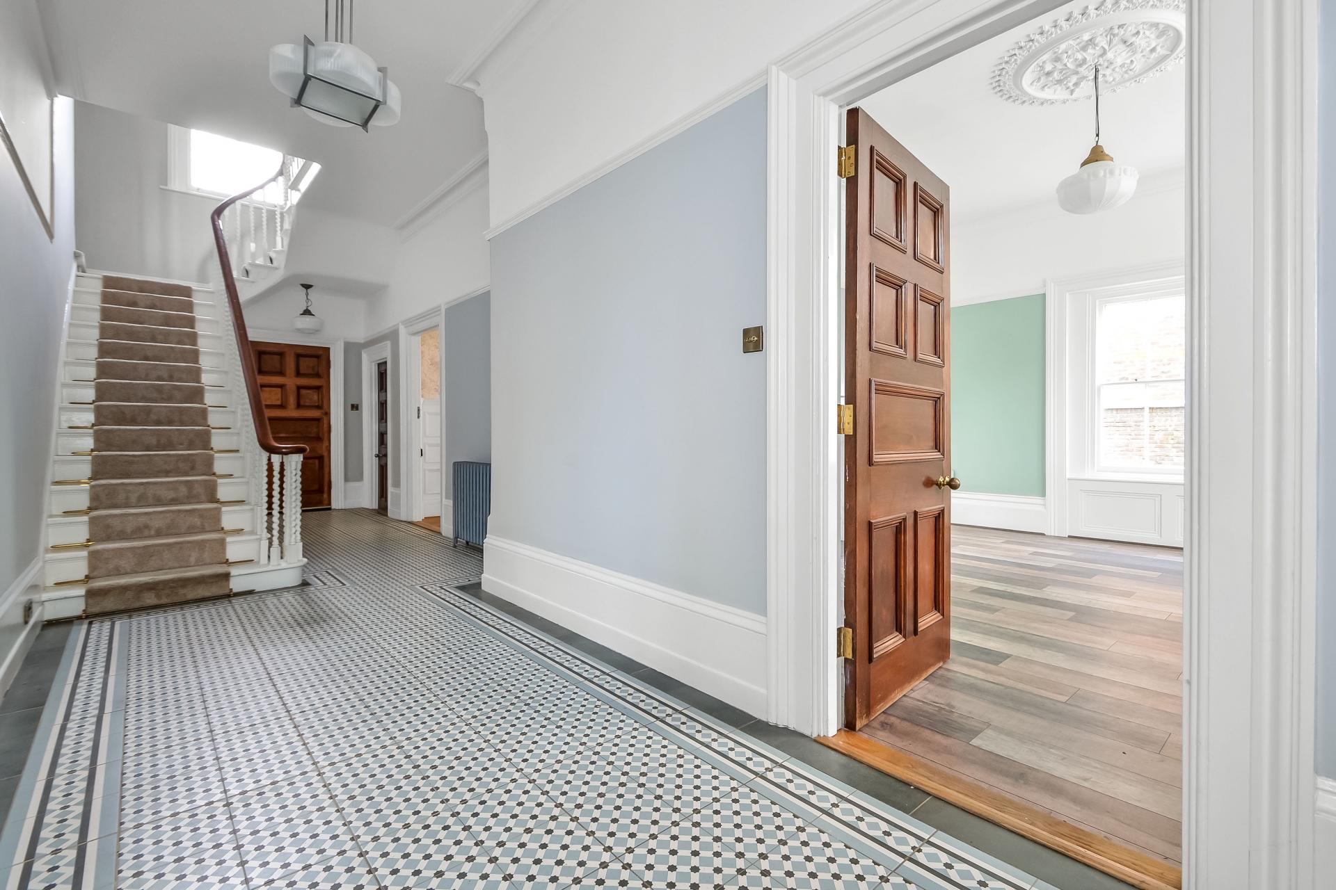 HALLWAY 30' 1" x 8' 9" maximum (9.17m x 2.67m) High ceilings extending approximately 10'9" in height, ceiling coving, feature balustrade staircase with wooden hand rail and twisted spindles and central carpeting rising to first floor with feature arched leadlight frosted glass window to rear aspect, high skirting boards, feature architraves, tiled flooring with underfloor heating, roll top radiator, door leading to rear garden, doors to primary rooms, access to cellar/basement.