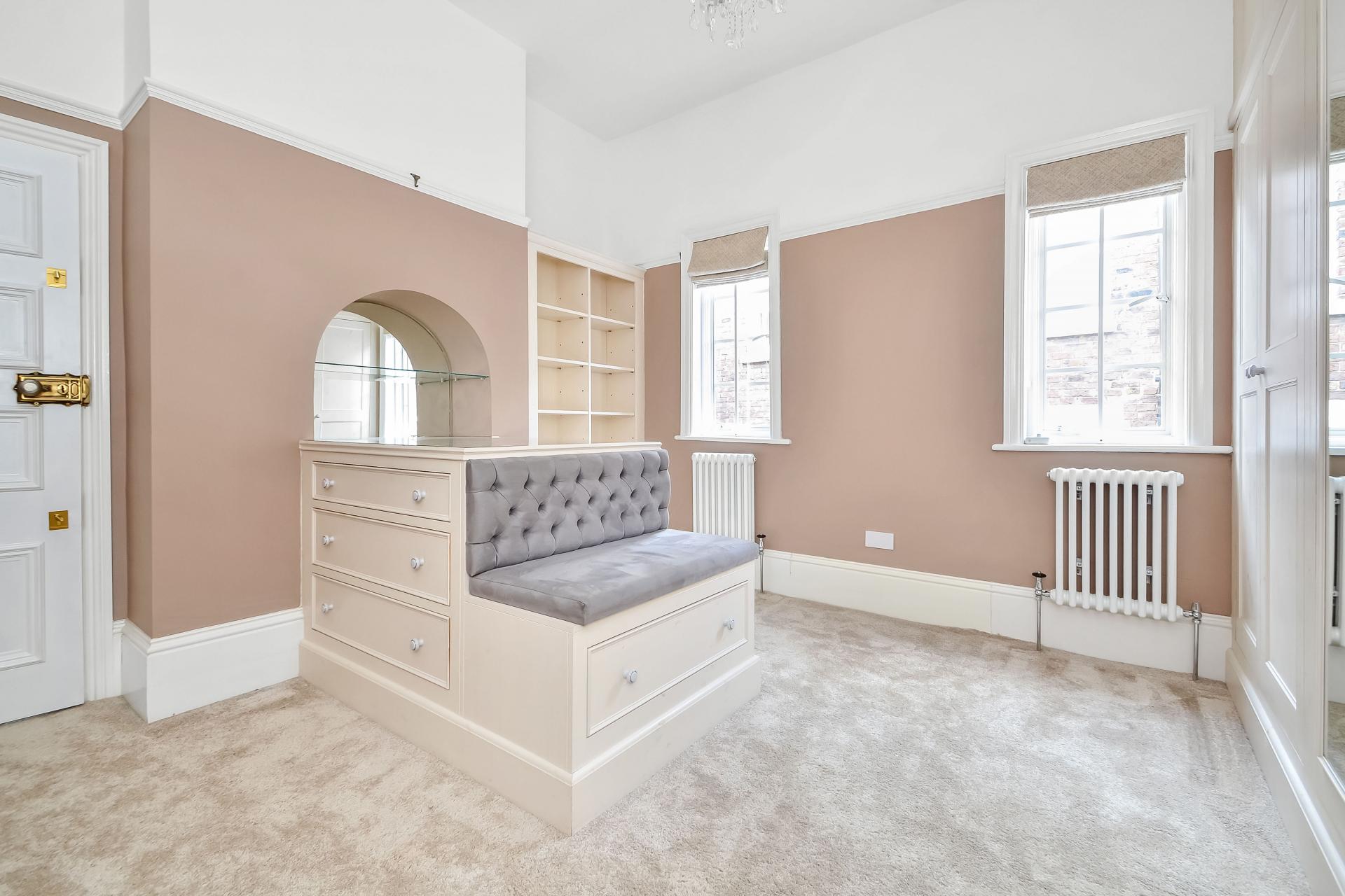 WALK-IN WARDROBE / SAFE ROOM 15' 5" x 12' 2" (4.7m x 3.71m) Range of built-in wardrobes to one wall with hanging space and shelving, high level storage space over, windows to side aspect, two roll top radiators, range of open shelving, central unit with mirror surface and recess with glazed shelf and matching mirror, seating area with cupboard under, range of drawers, multiple lock door.