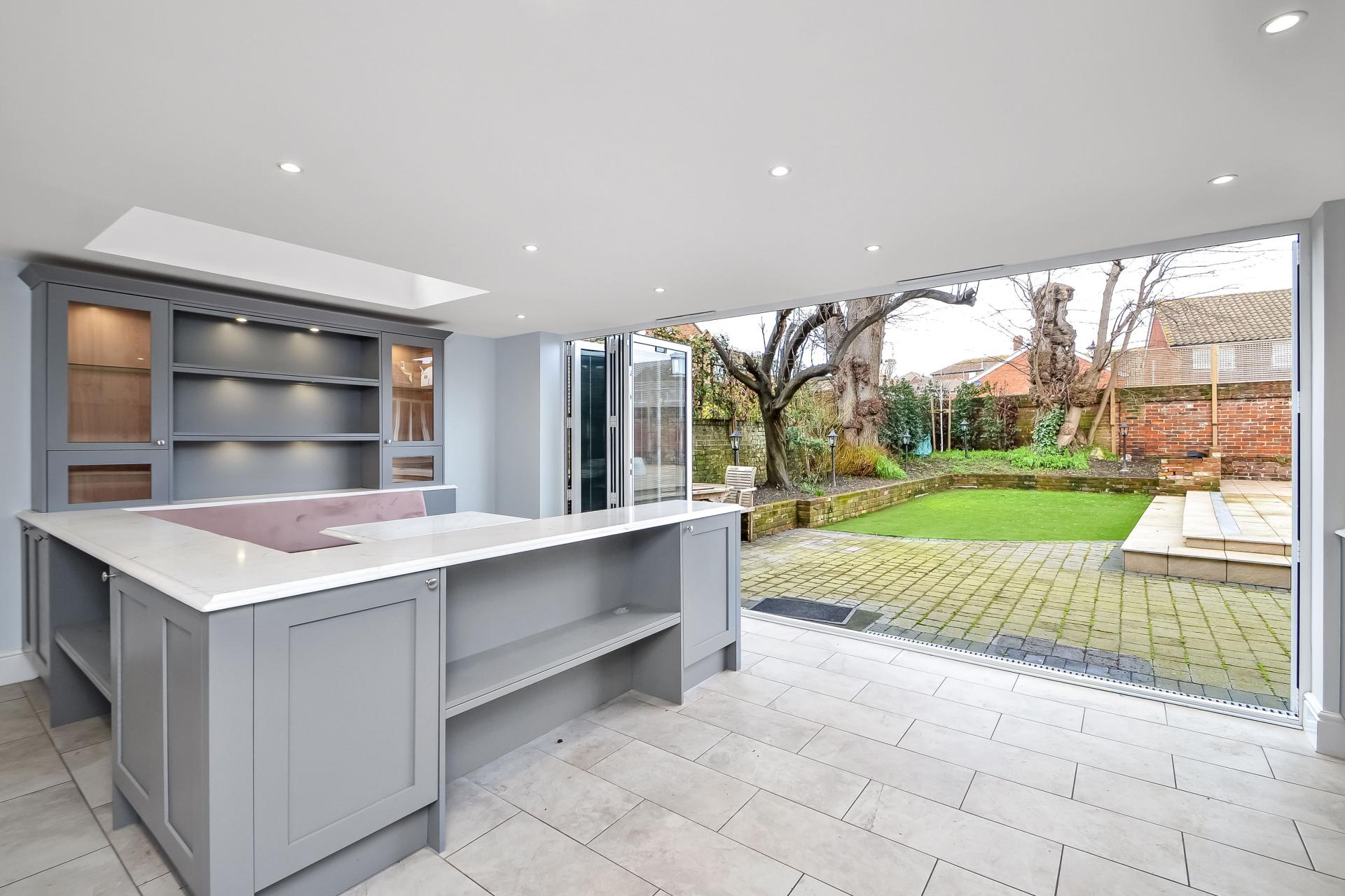 OPEN PLAN KITCHEN / BREAKFAST ROOM 26' 3" x 19' 11" decreasing to 18'9" at narrowest point (8m x 6.07m) Breakfast area: Dresser style unit with granite work surface and splashback, cupboards and drawers under, ceiling spotlights, bi-folding double-glazed doors with inset blinds leading to rear garden, U shaped Café style dining area with marble surface with cupboards and shelving under, dresser to one wall with glazed panelled doors, inset lighting with spotlights, Atrium skylight window, ceiling spotlights, tiled flooring with underfloor heating leading to: