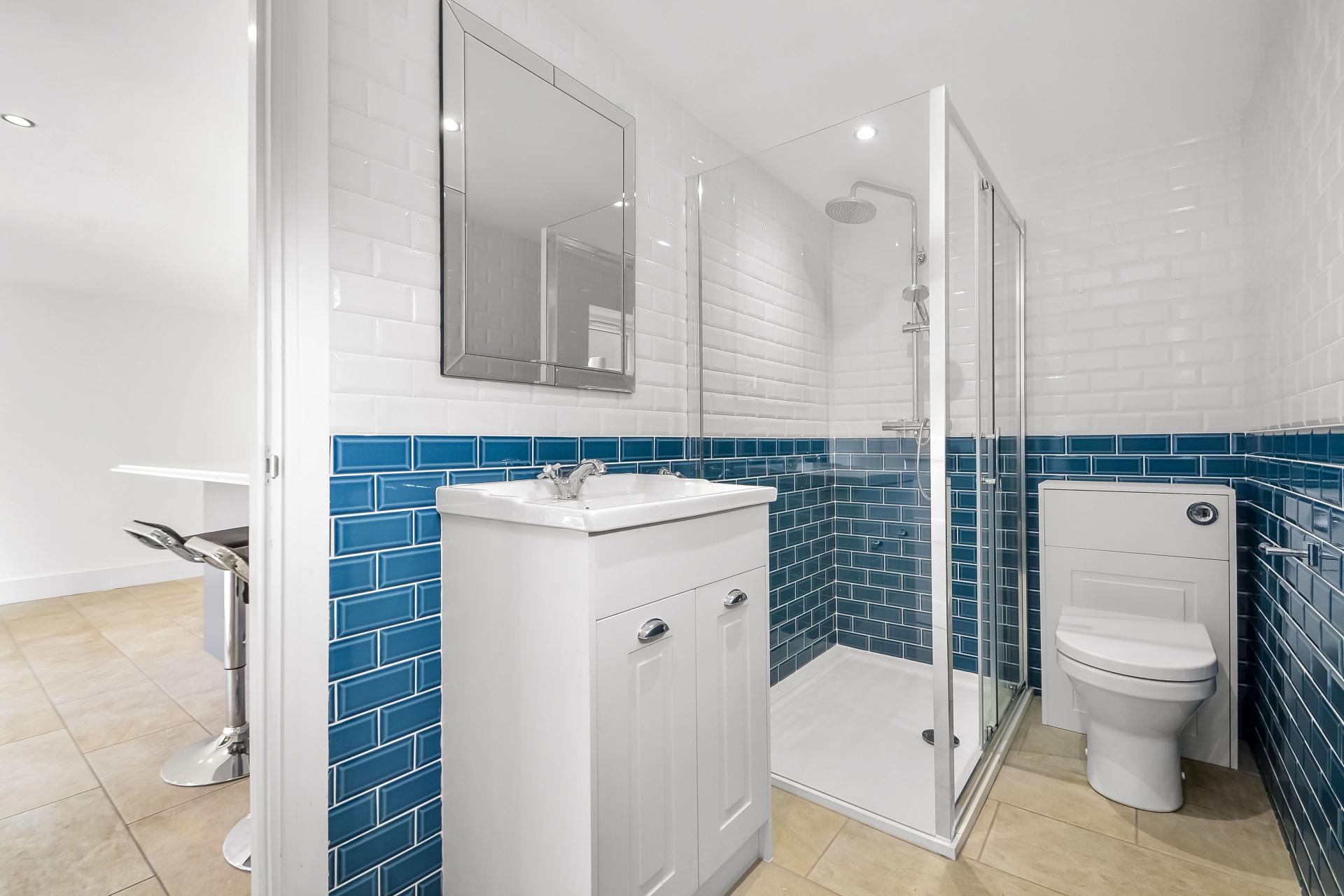 CLOAKROOM Arranged as two rooms, ceramic tiled to upper section with Art Deco green and black glass tiling to lower level, pedestal wash hand basin with circular mirror over, tiled flooring, window to rear asopect, towel rail, underfloor heating.