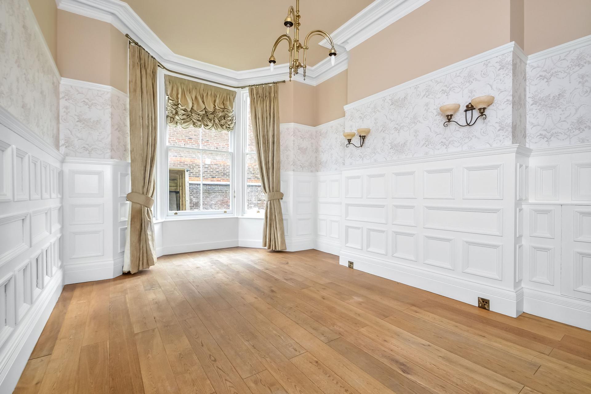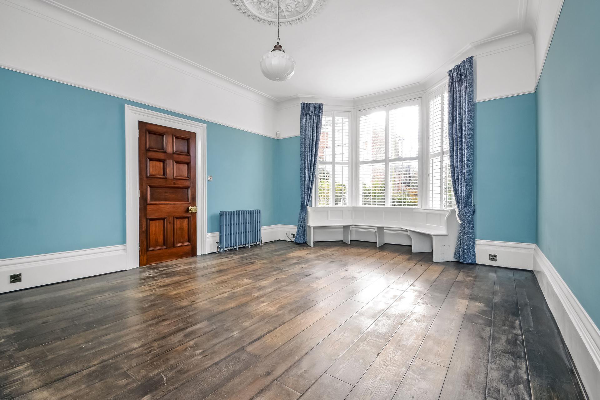 STUDY 17' 1" into bay window x 12' 1" (5.21m x 3.68m) Sash window to side aspect overlooking garden, high ceiling with coving and central rose, picture rail, painted panelling to half wall level, built-in low-level cupboard, roll top radiator, wooden flooring.