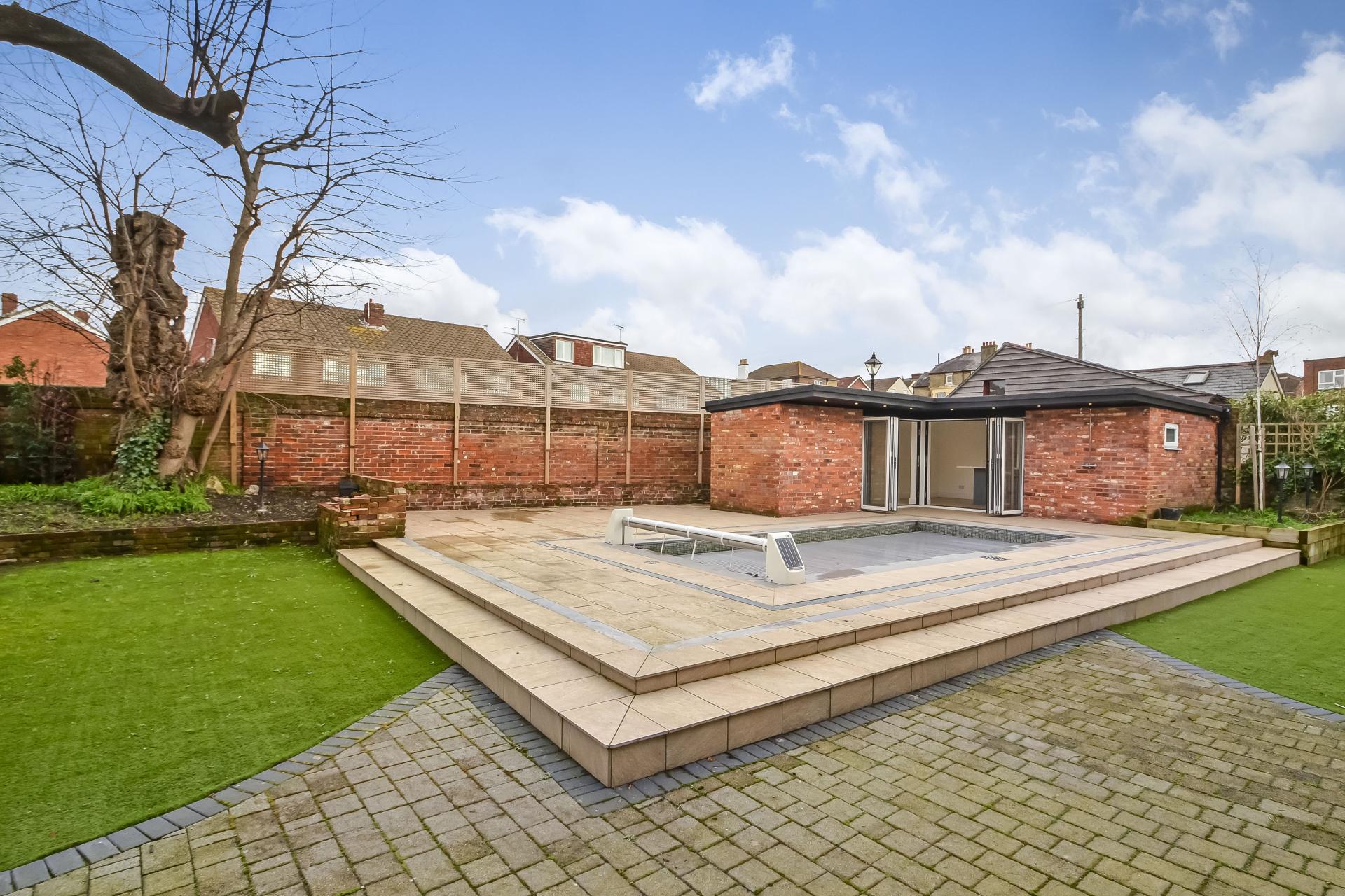 OUTSIDE To the right hand side of the property is a lawned garden enclosed by soldier railings with wooden built log store and pedestrian gate leading to primary garden, directly to the rear of the property is a paved patio and pathway with false grass area with fender style borders with shrubs and bushes, from this area are steps leading up to the swimming pool, directly to the rear of the kitchen via the bi-fold doors is a large patio area leading to further false grass area with brick retaining walls. To the rear of the swimming pool is a pump room with filtration power system and heating, twin gates to rear backing onto St. Bartholomew's Garden, external covered lighting, external shower, corner unit with bi-folding doors leading to: