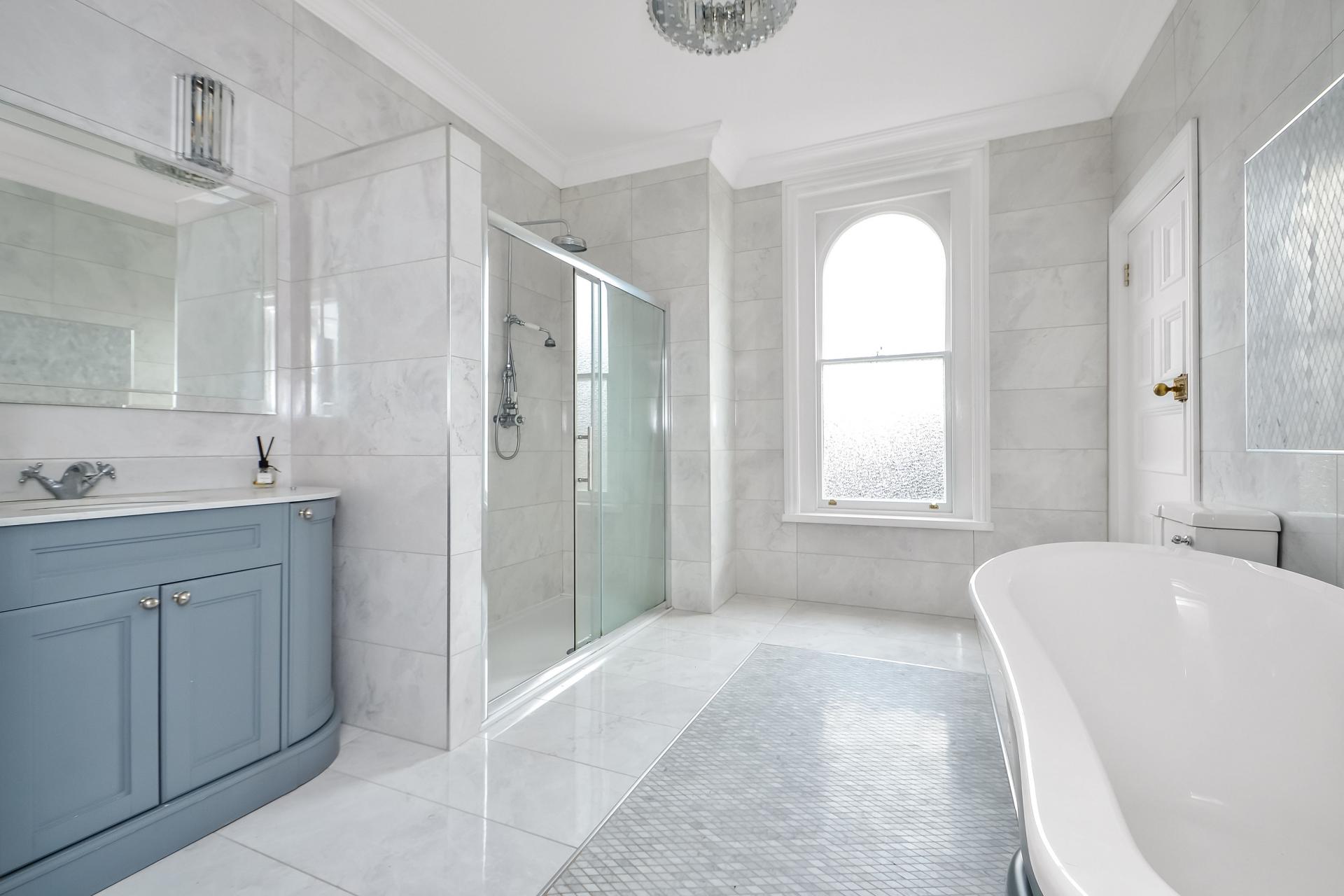BEDROOM 1 18' 2" x 15' 1" (5.54m x 4.6m) Sash windows to front aspect with plantation shutter blinds, high ceiling approximately 10'9" in height with central rose and coving, picture rail, central chimney breast with surround fireplace and tiled inlay, high skirting boards, two roll top radiators, door to Jack & Jill style bathroom.